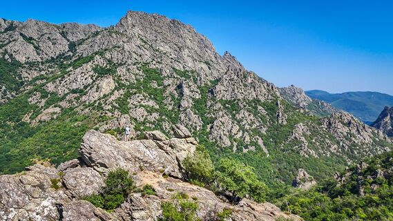 Montée vers le Col de Bardou Descendre dans les gorges d'Héric en suivant le balisage trail du parcours n° 5 Traverser le Pont d’Héric. Emprunter le sentier en montée, ombragé et régulier, jusqu’au Col de Bardou. - Option : accès au belvédère de Bau Filiti (200 m aller-retour) pour vue panoramique sur les aiguilles du Caroux.