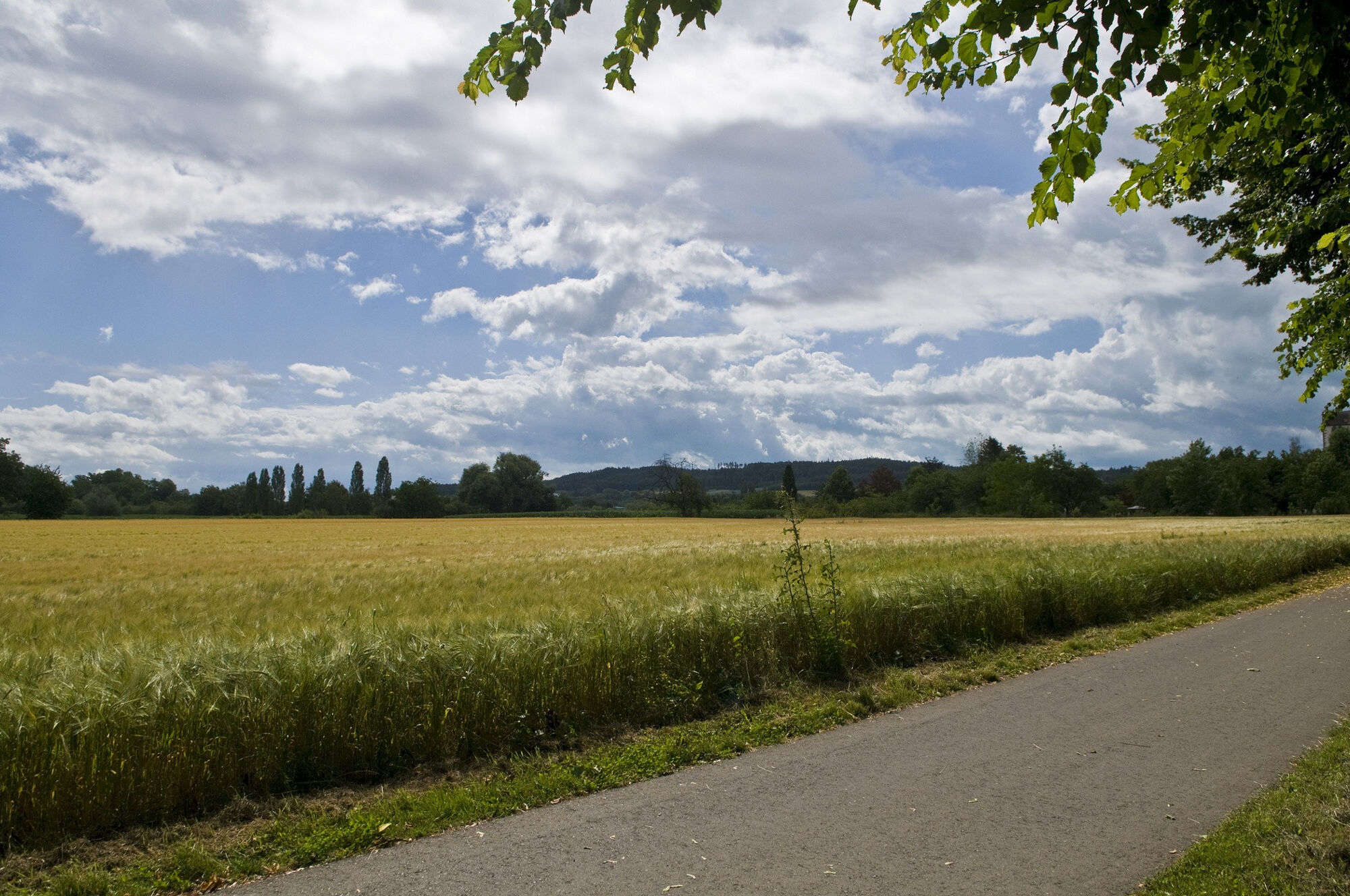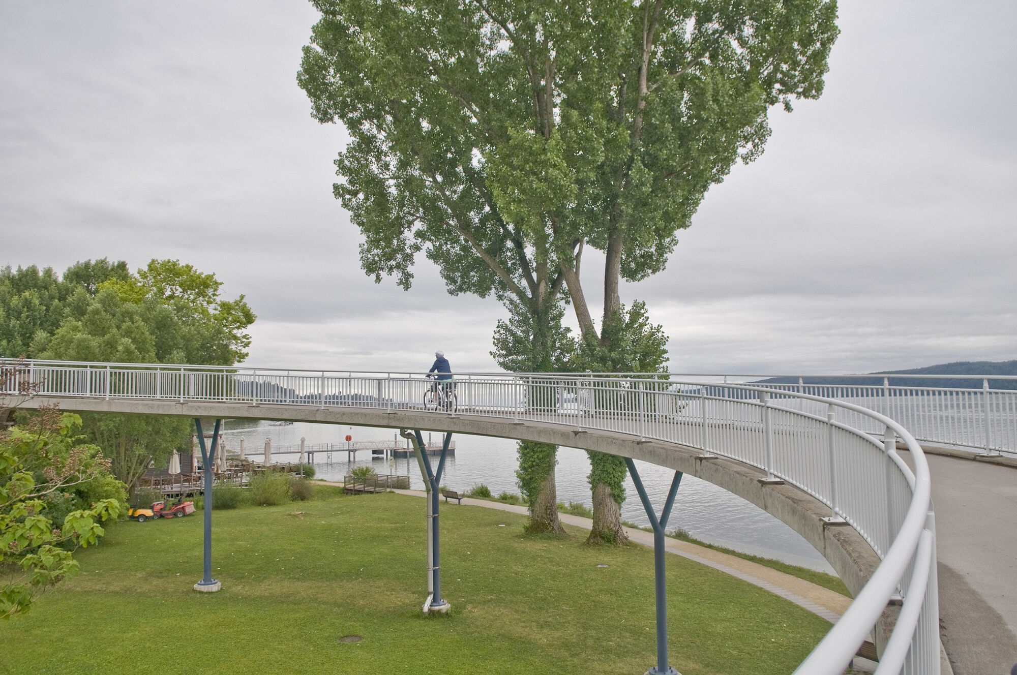 Nachdem es über Nacht gewittert und auch am Morgen noch stark geregnet hatte, haben wir gestern mit Museumsbesuchen und Wellness in der Bodensee Therme Überlingen einen entspannten Tag ohne die Fahrräder verbracht. Ähnlich entspannt lassen wir es an unserem fünften Urlaubstag angehen und starten nach einem gemütlichen Frühstück in der Pension ganz in Ruhe unsere vierte Tour mit den E-Bikes am Bodensee. Der Himmel ist noch etwas grau. Um uns einen Eindruck von der Wetterlage am See zu verschaffen, fahren wir erst einmal an den Hafen Unteruhldingen. Vorne am Wasser finden wir eine Stelle mit direktem Blick auf das Pfahlbaumuseum, einem am See gelegenen Freilichtmuseum mit Museumsbau, das den Besuchern mit Rekonstruktionen das Leben am See während der Stein- und Bronzezeit vermittelt. ImUmland erhebt sich die barocke Klosterkirche Birnau. – trotz des grauen Himmels eine großartige Aussicht! Wir schwingen uns auf die Räder und machen uns,vorbei am frisch renovierten Alten Bahnhof Unteruhldingen, hinter dessen historischen Mauern sich auch ein Trauzimmer der Gemeinde Uhldingen-Mühlhofen befindet, auf den Weg Richtung der nahegelegenen Seestadt Überlingen. Sollte das Wetter nicht mitspielen, können wir jederzeit spontan umkehren. Auf einer Holzbrücke geht es über den Fluss Aach, durch einen kleinen Wald und vorbei an Getreidefeldern. Kurz vor dem Ortsteil Seefelden informiere ich mich an einer Infotafel über das Naturschutzgebiet Seefelder Aachmündung. Prompt erblicken wir, als wir ein Stück gefahren sind, zwei Graureiher auf einer Wiese am Wegrand.