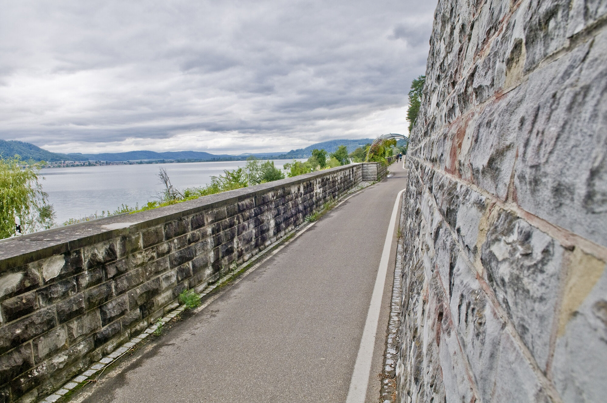 Unweit des Naturschutzgebietes biegt der Bodenseeradweg ein Stück ins Umland ab und verläuft eine Weileparallel zur Straße, vorbei an Stahringen und weiter nach Güttingen. Wir fahren an Getreidefeldern und Apfelplantagen vorbei und stoßen auf Wegweiser zu einem großen Obsthof, der saisonale Früchte verkauft. In Liggeringen entdecken wir einen Brunnen, an dem wir uns ein wenig erfrischen können. Die Straße im Dorf geht bergauf. Rückblickend liegen auf dieser Etappe die Abschnitte mit den größten Steigungen – an sich verläuft der Bodenseeradweg rund um den See meist eben und flach. Am Ende des Dorfes, geht es von der Straße nach rechts auf den Radweg in Richtung Langenrain. Einen Abstecher wert wäre eigentlich die linkerhand liegende Marienschlucht, eine verwunschene Naturschlucht. Das Areal ist jedoch leider schon seit geraumer Zeit für Wanderer gesperrt, und sofolgen wir weiter dem ausgeschriebenen Radweg, der uns – juhu – stetig bergab in Richtung Wallhausen hinunter an den See führt. Bei Dettingen finden wir noch einen Trinkwasserbrunnen. Hier füllen wir die Flaschen mit frischem Wasser auf und machen kurz Rast auf der gegenüberliegenden Sitzbank. Oberhalb der Gemeinde Wallhausen fahren wir an einem Waldgebiet vorbei und radeln die steile Straße hinab in den Ort, der sich auch als Weindorf bezeichnet. Da wir auf dieser Seeseite noch etwas essen wollen, schließen wir unsere Räder am Ufer 39 beim Strandbad Wallhausen an und setzen uns auf die Terrasse vor dem Restaurant. An einem sonnigeren und wärmeren Tag hätte sich hier noch der Besuch des Strandbads angeboten – dafür ist es uns heute aber eindeutig zu frisch. Entspannt, satt und erfüllt von den Erlebnissen dieses Tages machen wir uns auf zum Anleger, um die nächste Fähre nach Überlingen zu nehmen. Die Überfahrt auf dem Oberdeck vermittelt uns erneut ein perfektes Urlaubsfeeling. Vom Ziel der Fährfahrt aus – dem Landungsplatz in Überlingen – liegt nur noch die kurze Strecke zurück nach Uhldingen-Mühlhofen vor uns. Zweimal sind wir diese Strecke schon in Richtung Überlingen gefahren, nun erleben wir den See aus der anderen Richtung kommend – ein ganz neuer Eindruck. Wir schieben die Räder durch die Fußgängerzone, huschen gerade noch in einen Supermarkt, bevor dieser schließt, und radeln los. Von der Mühlenstraße biegen wir ab in den Strandweg und sind wieder am See unterwegs. Der kleine malerische Campingplatz in Nußdorf war mir vorher noch gar nicht aufgefallen, am Strandbad dahinter stoppen wir kurz und genießen von hier noch einen Blick auf das Wasser. Der Weg bis zum Schloss Maurach, einem ursprünglich als Gutshof genutzten Gebäudeensemble im Barockstil direkt unterhalb der Kirche Birnau, ist herrlich und wir genießen die abendliche Seestimmung. Am ehemaligen Bahnhof Birnau-Maurach nehmen wir spontan die recht steile Straße bergauf, da wir uns entschieden haben, doch noch einen Abstecher zur Basilika Birnau zu unternehmen. Auf der vor der Basilika errichteten Mauer lassen wir uns mitBlick auf den See und der beeindruckenden Barockkirche im Rücken ein Feierabendbier schmecken. Wieder an der Pension angekommen, schließen wir zunächst die Akkus der E-Bikes an den Strom und freuen uns auf einen gemütlichen Ausklang des Tages in unserem Zimmer. Bei der letzten und längsten Etappe unserer Seeumrundung am kommenden Tag liegen noch einmal einige Kilometer vor uns, die uns an den Untersee, auf die Halbinsel Höri und an den Hochrhein führen.