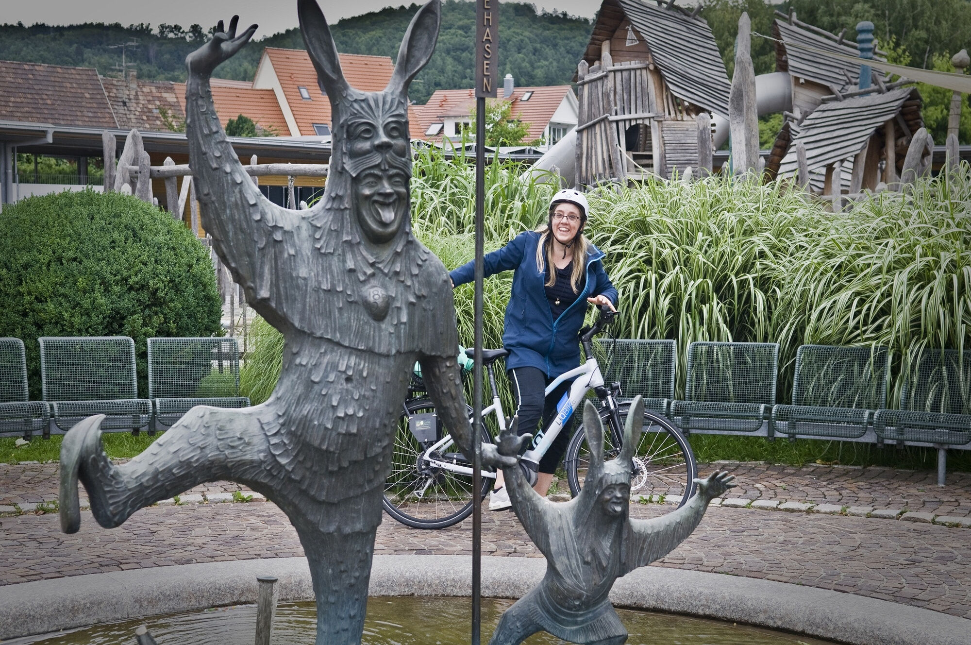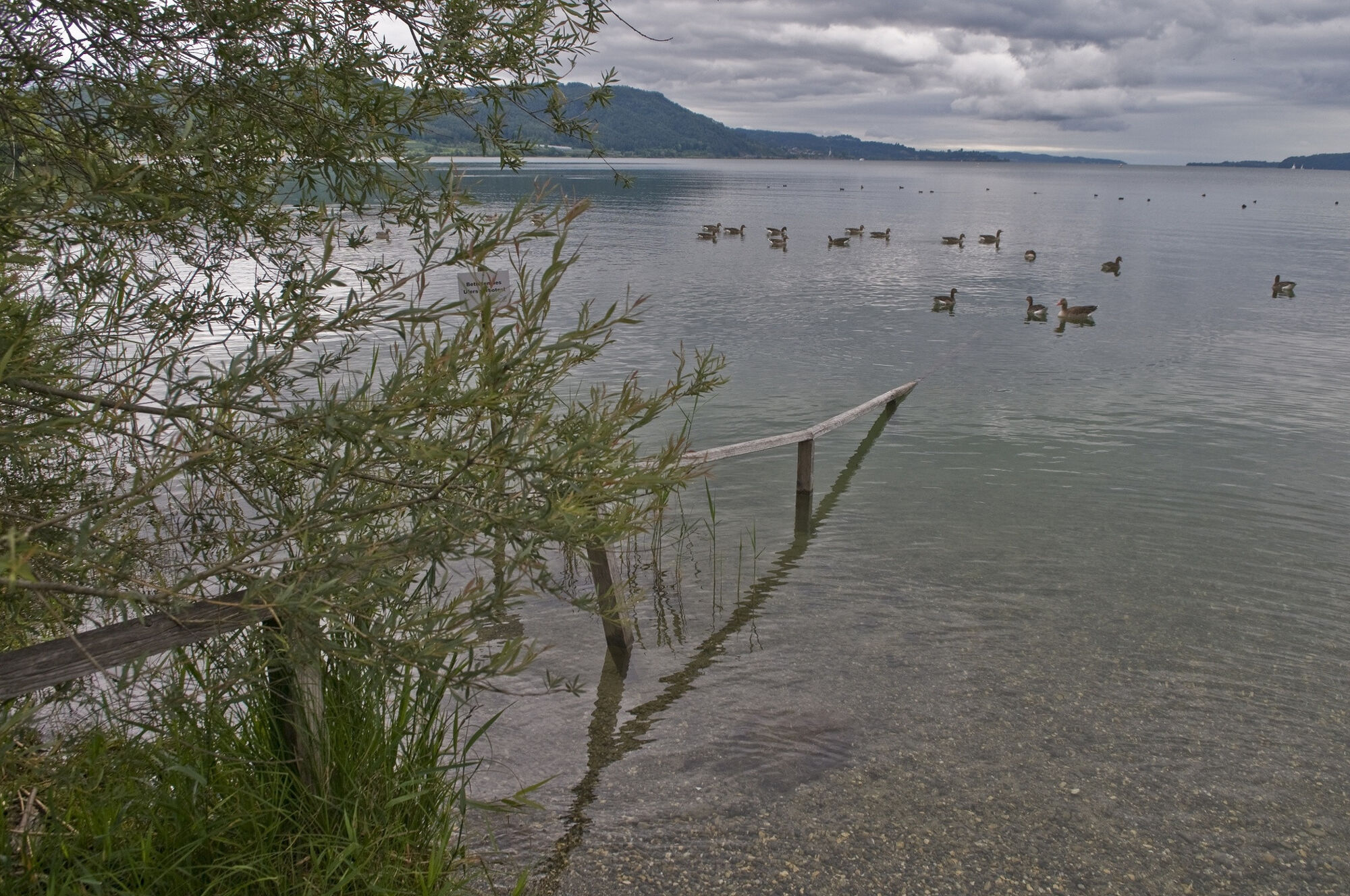 Kurz hinter der Wallfahrtskirche Birnau, die wir vom Seeufer aus schon bewundert hatten, beginnt es leider zu nieseln. Wir ziehen unsere Jacken über, nehmen Fahrt auf und radeln rasch durch den Überlinger Stadtteil Nußdorf. Weil es immer stärker zu regnen beginnt, stellen wir uns kurz vor dem – bei schönem Wetter – gut besuchtenOstbad Überlingen unter Bäumen unter und betrachten, wie die Regentropfen auf die im Hafen liegenden Sportboote prasseln. Als der Regen nachlässt, fahren wir weiter in die Innenstadt von Überlingen und gelangen auf die Hofstatt, dem Marktplatz beim Rathaus. Unsere Überlegung, ob wir die Tour fortsetzen, verlegen wir spontan ins Café im Rathaus, das uns mit einer köstlichen Auswahl an Getränken und Essen in einem einzigartigen Ambiente empfängt. Die kurze Einkehrpause hat sich gelohnt: Als wir wieder aufbrechen und die Räder Richtung Landungsplatz am See schieben, klart der Himmel tatsächlich auf. Am Ufer entlang führen wir die Räder zunächst zu Fuß durch den Badgarten, einem ehemaligen Garten des hier ansässigen Kapuzinerklosters, der seit 1868 auch Kurpark ist. Wir bleiben am Ufer des Überlinger Sees und fahren vorbei an derBodensee Therme und der Silvesterkapelle Goldbach, einer vorromanischen Kirche, in derem Inneren Wandmalereien aus der Mitte des 9. Jahrhunderts zu bestaunen sind. Wir haben Glück: während der Sommermonate ist die Kapelle jeweils Montag, Mittwoch und Samstag von 11 - 17 Uhr geöffnet. Um das Naturschutzgebiet Katharienenfelsen herum führt unsere Tour nach Sipplingen. Sehr praktisch: Beim Seepumpwerk der Bodensee Wasserversorgung gibt es eine Möglichkeit, unsere Trinkflaschen aufzufüllen. In Sipplingen machen wir einen Stopp an einem Seezugang und schauen auf das Wasser. Der Himmel sieht dramatisch aus, aber es bleibt zum Glück trocken. Um auf den Bodenseeradweg jenseits der Bahngleise zu gelangen, fahren wir über die große rundgeschwungene Brücke. In einer schönen Galerie am Fels geht die Strecke etwas erhöht über der Straße zunächst kerzengerade weiter – immer parallel zum See, der an dieser Stelle relativ schmal ist, so dass wir von hier einen schönen Blick sogar auf beide Uferregionen haben. Unsere erste Station in Ludwigshafen ist das Zollhaus, das heute ein Hotel mit Restaurant und Veranstaltungsräumen beherbergt und in dem regelmäßig Kunstausstellungen und Jazzfrühschoppen stattfinden. Vor dem Zollhaus steht eine Skulptur des Bildhauers Peter Lenk, das Tryptichon „Ludwigs Erbe“, von dem ich einfach ein Foto machen muss. Entlang der Uferpromenade schieben wir die Räder ein Stück, bevor wir die Tour im Sattel fortsetzen. Wieder auf dem Bodenseeradweg sind wir schon bald auf der schönsten Strecke dieser Etappe – einemLandwirtschaftsweg entlang des Naturschutzgebietes Bodman-Ludwigshafen. Auf Höhe eines wunderschönen Trompetenbaums in voller Blüte geht es nachlinks ab, weg von der Straße, ran ans Wasser. Mal durch dichtes Grün, mal direkt am Wasser entlang und mal vorbei an Feld und Wiese mit vereinzelt stehenden großen Bäumen – ein Blickfang – führt der Schotterweg uns durch die pure Natur. An einer idyllischen, unbewachsenen Uferstelle, an der der Zugang ins Wasser zum Baden allerdings nicht gestattet ist, vergnügen wir uns damit, ein paar Gänse im Wasser zu beobachten.