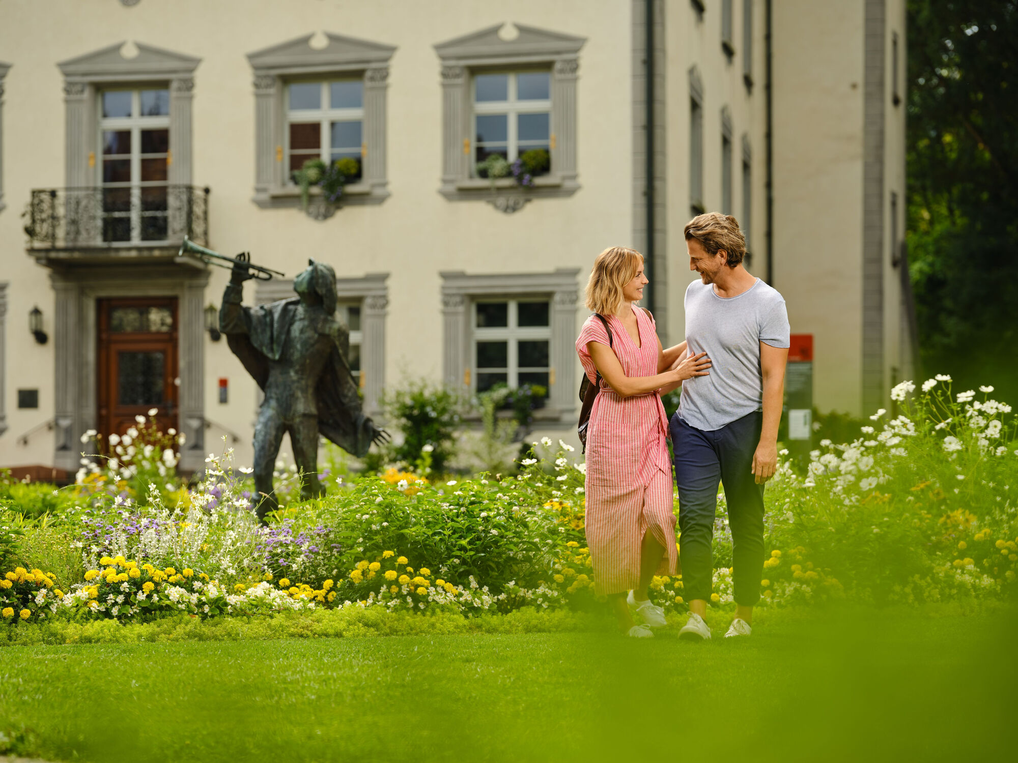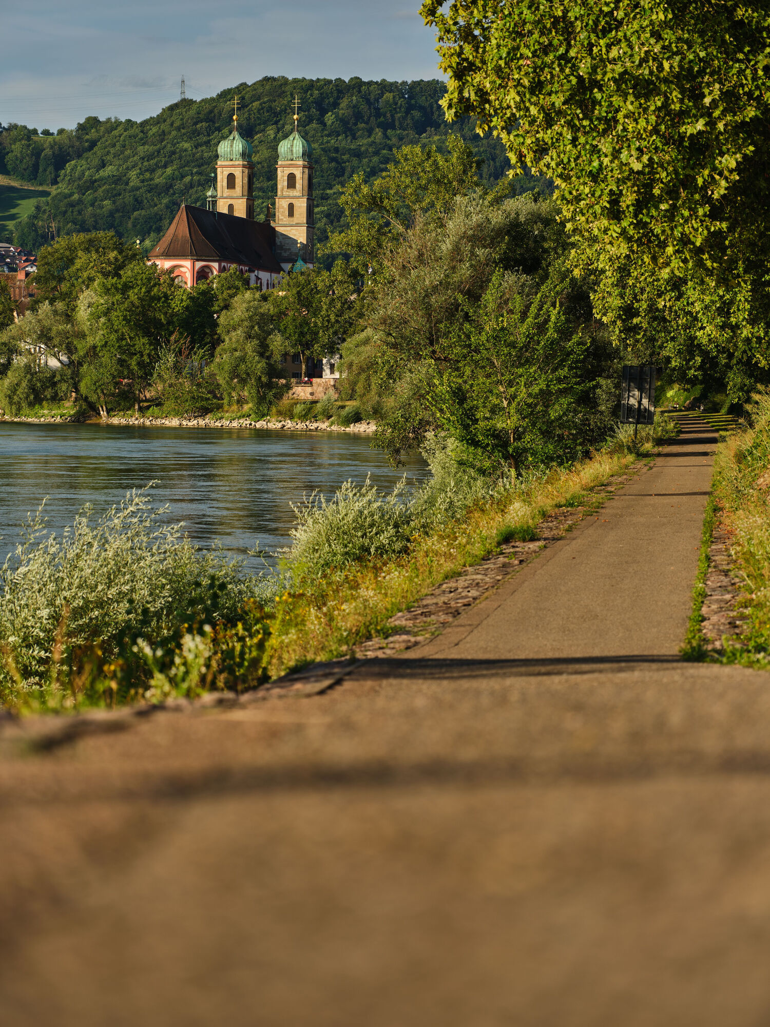 Schließlichführt uns die Harpolinger Straße nach Obersäckingen hinab. Wirpassieren die Sankt Martinskirche und überqueren die Schaffhauser Straße(B34) nach rechts versetzt geradeaus. Hier nimmt uns dieHeinrich-Hübsch-Straße auf, die uns nach Süden zum friedlichen Rheinuferwegbringt. An der Uferpromenade beginnt der gemütliche Spaziergang indie mediterrane Altstadt von Bad Säckingen. Am besten bleiben wir dem Uferwegbis zur imposanten Holzbrücke treu, unternehmen dann noch einen kleinen Umwegam charmanten Schloss Schönau vorbei und begeben uns in die Stadtmitte mit dem ehrwürdigen St. Fridolinsmünster. Der Weg zum nahegelegenen Bahnhof istausgeschildert.
