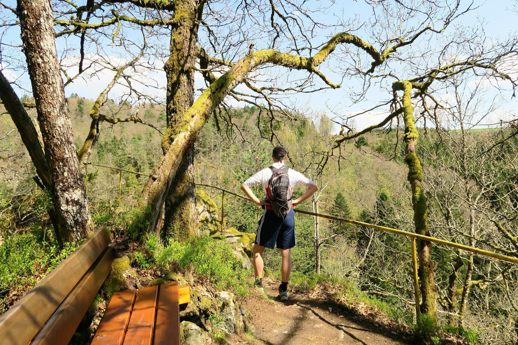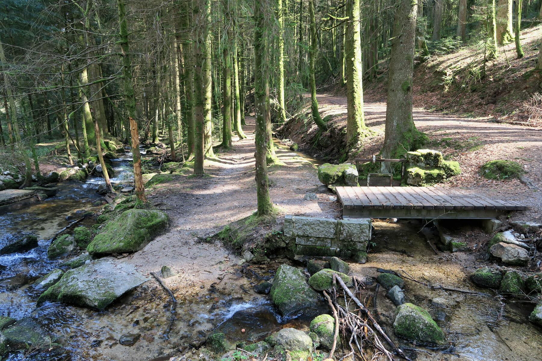 Wir machen uns wieder auf den Weg, denn mit dem nahen Kaibenfelsen lockt das nächste sehenswerte Ziel am Wegesrand. Der Aussichtspunkt ist von der Wegkreuzung über den Albsteig in wenigen Minuten zu erreichen. Die letzten Meter zum schönen Rastplatz sind mit einem Geländer gesichert, jedoch ist der Weg nie wirklich schwer. Der Kaibenfelsen besteht aus Granit, der hier und in der Umgebung häufig zutage tritt. Verwitterungsprozesse wie die granittypische Wollsackverwitterung lassen sich an etlichen Stellen ideal studieren. Vom Kaibenfelsen steigen wir kurz zurück zur Kreuzung und folgen dem Albsteig nordwärts, der sich zunächst als breiter Weg präsentiert, sich jedoch bald als schmaler Pfad in Richtung Albsteg, 530m, senkt. Wir bleiben dem Albsteig treu und erreichen wenige Minuten später die Mündung des Höllbaches und nach dessen Überquerung einen weiteren herrlichen Vesperplatz, der uns zudem die Möglichkeit bietet, die formenden Kräfte des Wassers aus nächster Nähe zu betrachten. Am kleinen Albstrand können wir Wasserkolke und gerundete Flusskiesel anschauen und die gewaltige Erosionsleistung der Alb bestaunen.