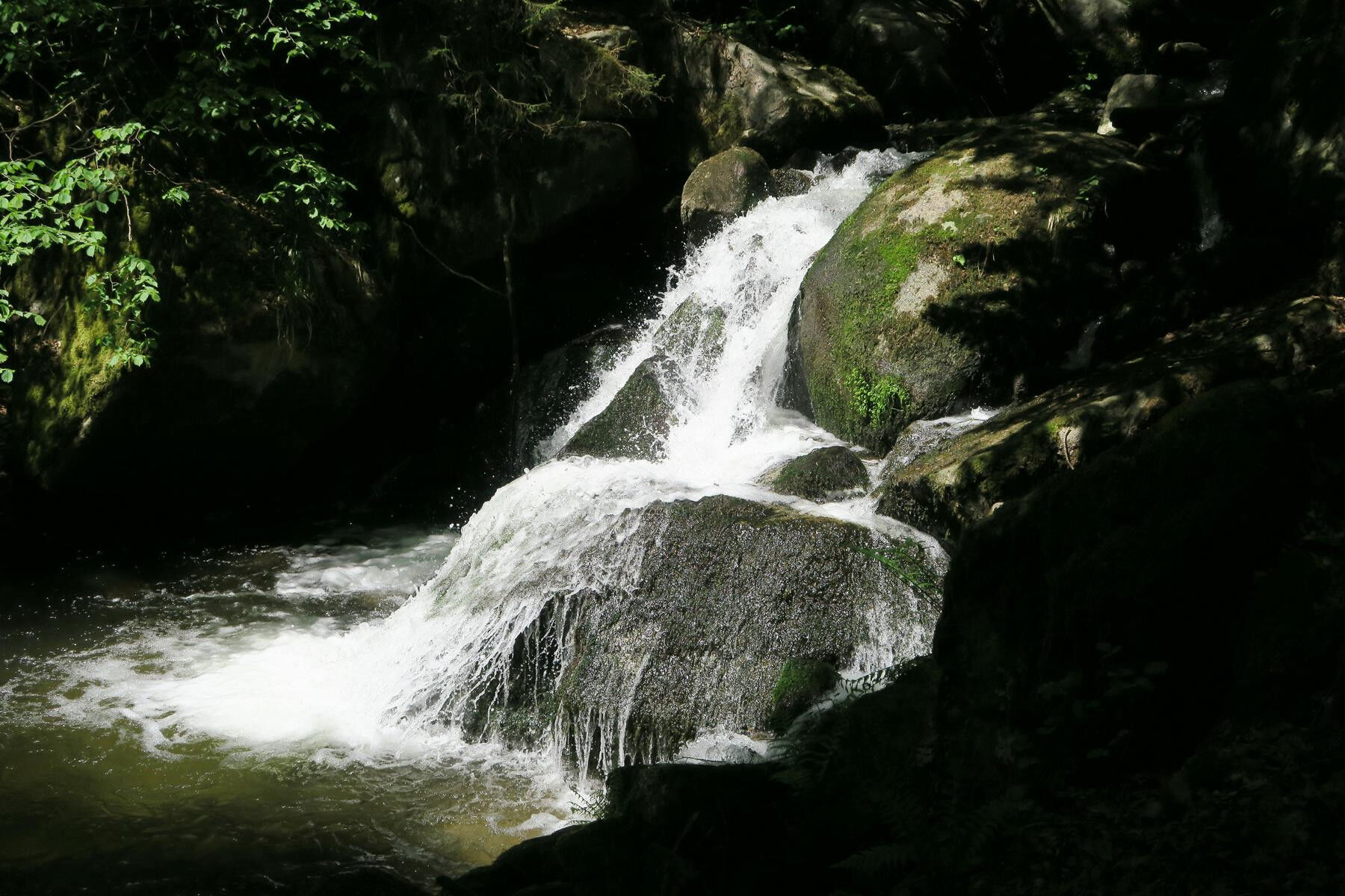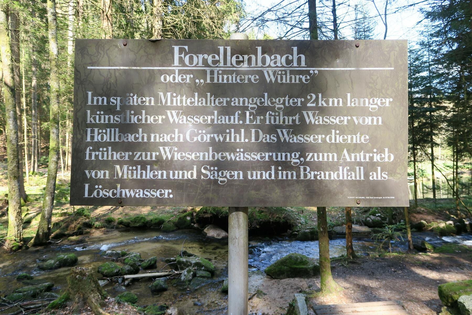 Besonders im Hochsommer fällt es schwer, diesen herrlich kühlen Platz zu verlassen. Zudem steht nun der steile Anstieg durch die Höllbachschlucht an. Der teilweise schmale und bei Nässe rutschige Pfad führt kurzweilig hinauf zum großen Höllbachwasserfall. Das tief eingeschnittene Kerbtal des Höllbaches bildet den Einschnitt zwischen Görwihl und Burg und veranschaulicht beispielhaft das typische Gesicht der Schwarzwaldsüdabdachung, namentlich das Zusammenspiel aus schluchtartigen Tälern und sanft einfallenden Terrassen – ein Ergebnis der hohen Reliefenergie der dem Rhein zuströmenden Gewässer. Unser Weiterweg führt im Folgenden etwas eintönig am Hornstollen, 600m, vorbei über breite Forstwege zum Wegweiser Hintere Wühre. Wenige Meter weiter verlassen wir die Rautenmarkierung nach rechts und schlendern gemächlich direkt entlang des künstlichen Bachlaufs hinauf zum Wührenabgang, 730m. Geschickt wird das Wasser dem Höllbach entnommen und in die Kanäle geleitet – entfernt fühlt man sich an die Freiburger Bächle erinnert. Mit dem Weiterweg zur Grillhütte am Sägmoos läuten wir die Rückkehr nach Görwihl ein, wobei wir neben der Hütte auf die Markierung achten und die Straße überqueren. Ehe wir die Panoramawiesen oberhalb des Ortes erreichen sind noch einmal wenige Aufwärtshöhenmeter zu bewältigen. Anschließend gelangen wir von hübschen Fernblicken zu den Alpen begleitet zum Ortsrand und zur Kirche von Görwihl.