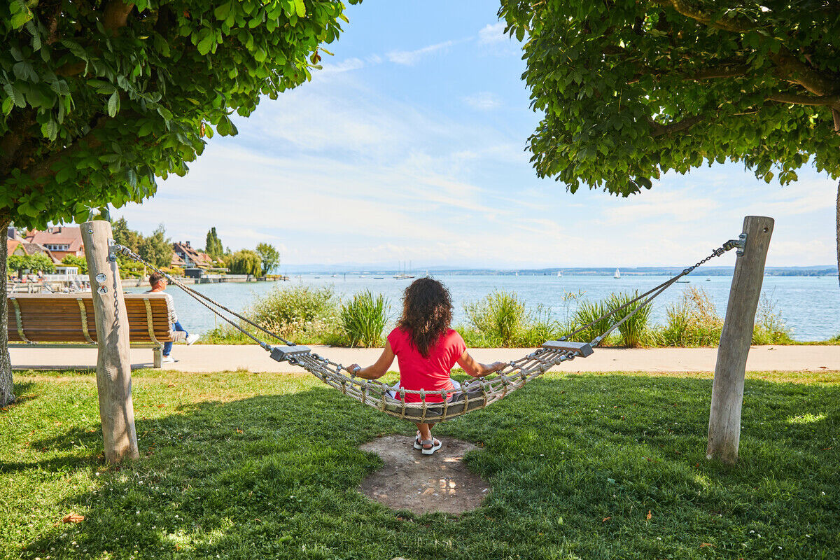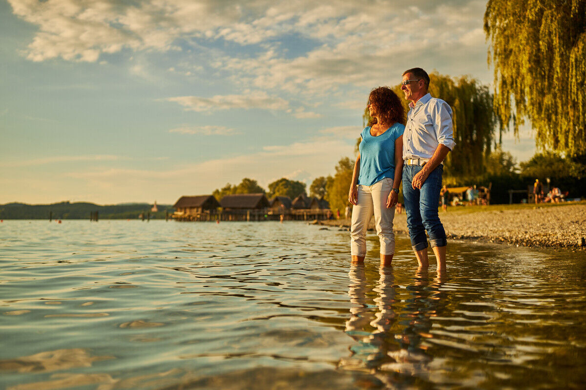 Du biegst nun am Ende der Alten Uhldinger Straße links ab und spazierst die Seefelder Straße entlang, bis Du auf Deiner linken Seite das Hotel Seevilla passierst. Hier zweigst Du rechts ab und kommst in den Uferbereich des Bodensees. Auf der rechten Seite siehst Du den Eingang zu den bekannten Pfahlbauten. Biege hier links in die Straße Strandpromenade ab: Der Zugang zum Naturstrandbad liegt rechts von Dir. Unsere kleinen Gäste freuen sich über einen super schönen Spielplatz direkt am Bodensee und einen Abenteuer-Golf-Platz. Wenn Du am Ende der Strandpromenade rechts abzweigst, läufst Du die West-Mole entlang, passierst den kleinen Fischerhafen und das Büro des Hafenmeisters, um nach ca. 150 m zum Schiffsanleger zu gelangen. Von hieraus fahren die Schiffe der weißen Flotte, das Schiff zur Mainau und diverse Ausflugsschiffe ab.