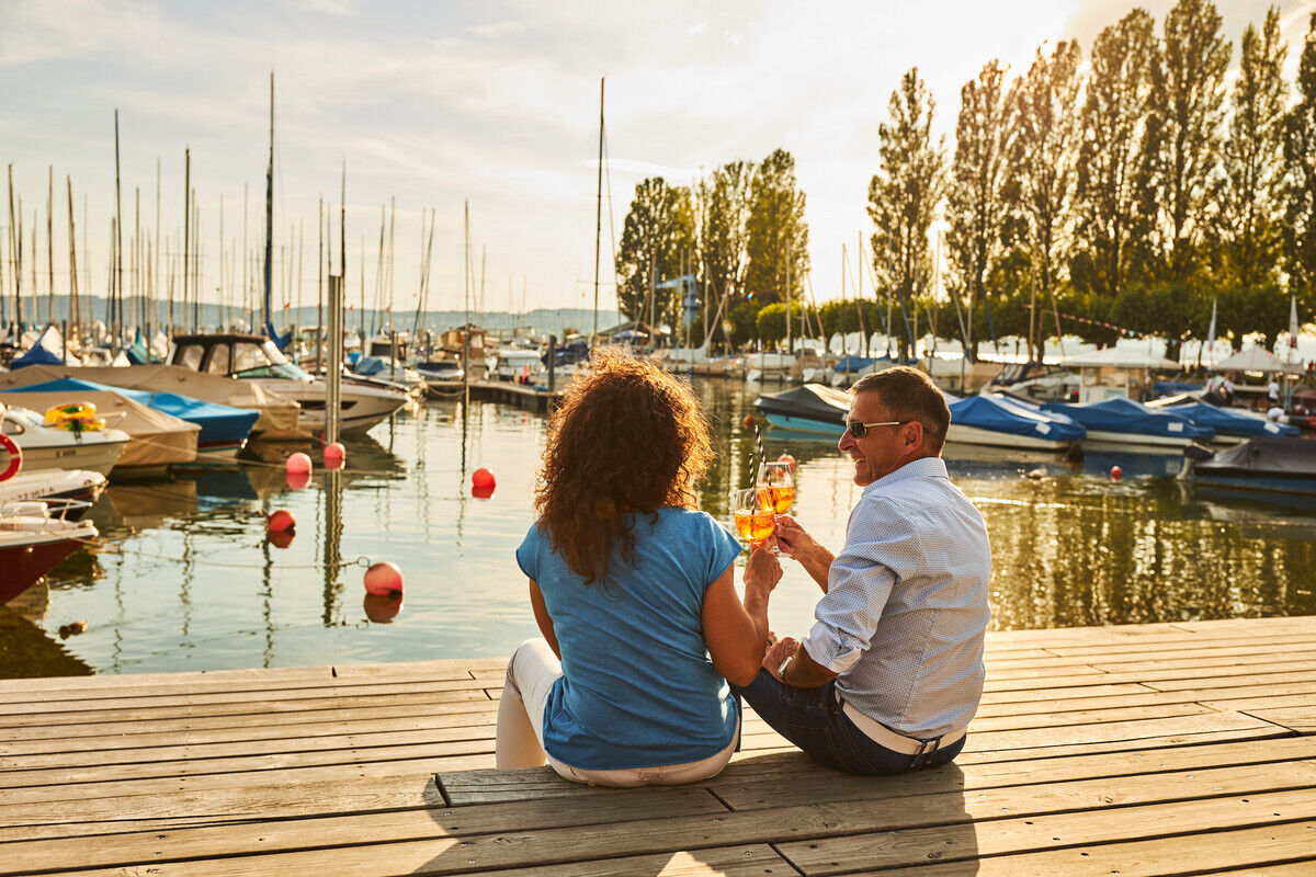 Dein Weg führt Dich zurück zur Uferpromenade. An der Bootsvermietung Weber, wo aus Du aus einer Vielzahl an Booten wählen kannst, schlenderst Du rechts am Hafen entlangzur Ost-Mole. Am Anfang dieser Mole können E-Bikes geladen werden. Auf der Ost-Mole wird Erholung großgeschrieben. Zahlreiche Sitzmöglichkeiten, Hängematten, der Welterbe Pavillon und die Holz-Welle laden zum Relaxen ein. Hier bist Du dem See ganz nah und kannst herrliche Ausblicke auf das See- und Alpenpanorama genießen. Auch ein Bouleplatz findest Du auf dieser Mole.