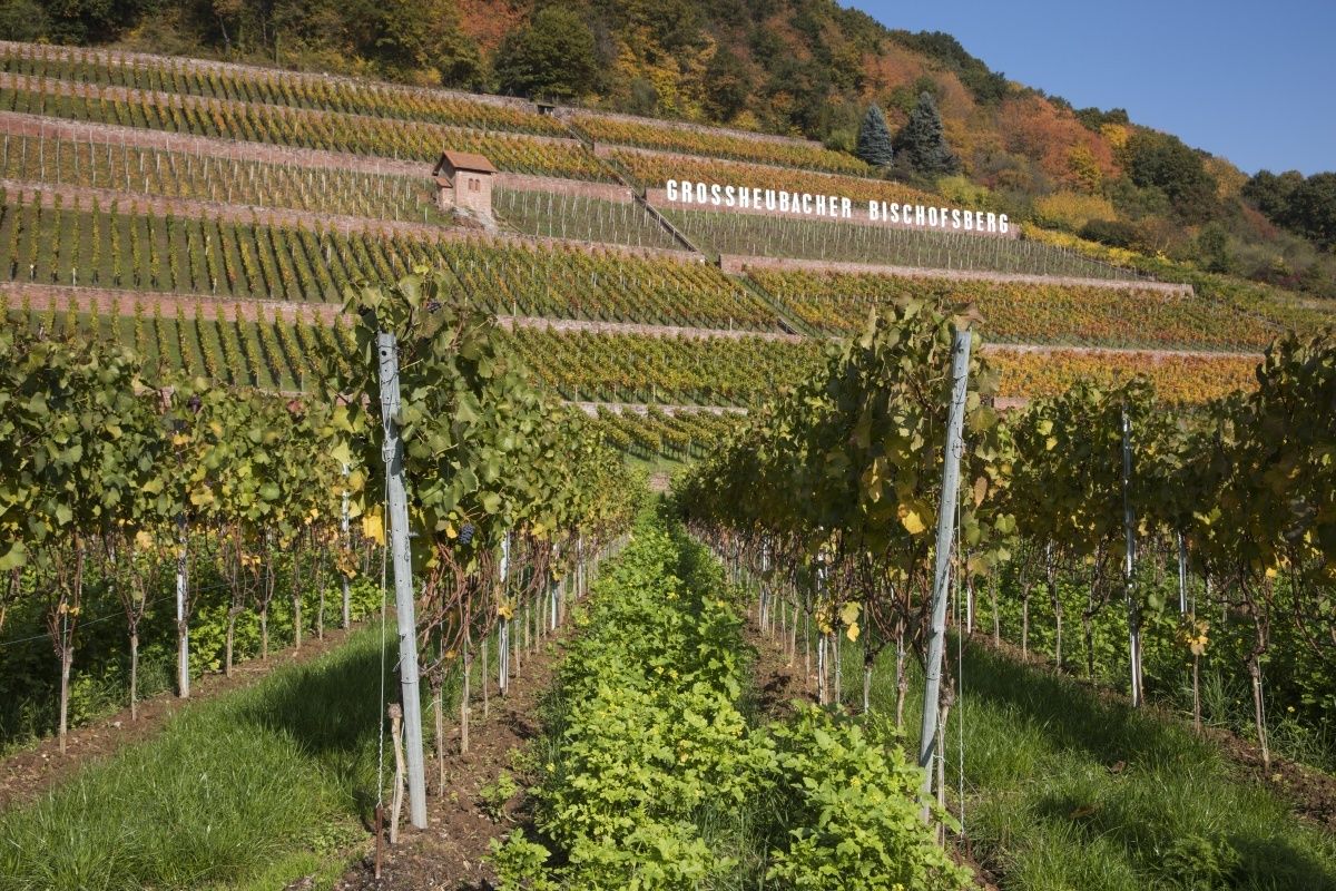 Auf diesem schönen Panoramaweg laden zahlreiche Ruhebänke zum Verweilen ein. Nach etwa 2 km treffen wir auf den Weinberg der Staatlichen Hofkellerei Würzburg. Diese Lage is ca. 4 ha groß und ausschließlich mit Rotweinreben bepflanzt. Wir sehen jetzt auch schon das Kloster Engelberg. Über den Steigeweg erreichen wir den Weinort Großheubach. An der Fasanenallee biegen wir nach rechts ab und gelangen an eine weitere Straße, die ebenfalls zur Fasanenallee gehört.