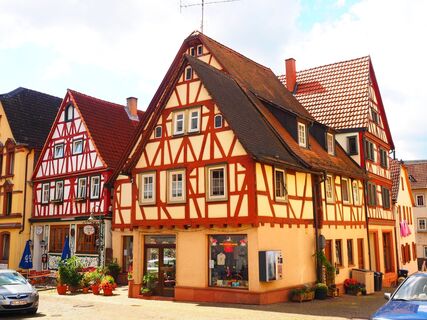 Hier wenden wir uns nun erneut nach rechts und folgen der Straße bis zu ihrem Ende, an dem wir einem Schotterweg nach links folgen. Am Ende des Schotterweges überqueren wir schließlich den Frankenring zu unserer Linken und wandern geradeaus auf der Frühlingsstraße bis zur Röllfelder Straße. Wir folgen der Röllfelder Straße geradeaus am Friedhof vorbei und biegen anschließend nach rechts ab. Am Ende der Straße führt uns linker Hand die Friedhofstraße zur Kirche von Großheubach und geradeaus weiter in die verkehrsberuhigte Kirchstraße. An deren Ende wenden wir uns nach links und wandern auf das Alte Rathaus von Großheubach zu.