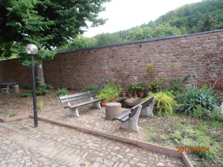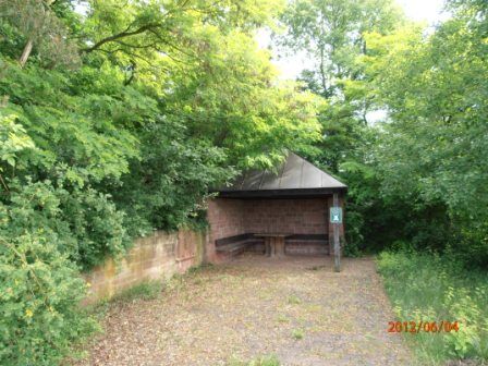 Nachdem wir die Höhe erreicht haben, geht es wieder ein wenig bergab bis zu einem überdachten Picknickplatz. Hier wenden wir uns nach links, verlassen durch ein Metalltor die Weinberge und kommen in den Wald. An einem Wegedreieck folgen wir der rechten Alternative in Richtung Rück/Schippach, die uns durch ein weiteres Tor wieder in die Weinberge hineinführt. Wir gelangen an eine Garage, an der wir nach links ein Bachtal durchqueren.