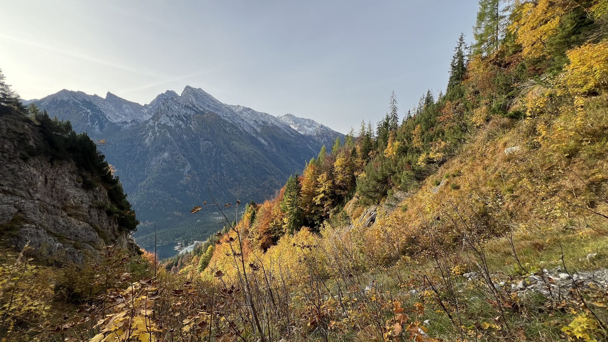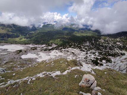 Nach dem Edelweißlahner beginnt der Abstieg. Achtung: Ein inoffizieller Weg zweigt direkt unter dem Edelweißlahner Richtung rechts ab, aber dort erreicht man nur einen "Geheimspot" unter dem Überhang des Lahners, wo man auf den Hintersee blicken kann. Wir folgen dem Weg noch ca. 500m auf dem Grat Richtung NO, bis ein steiler Abstieg durch Latschenkiefer-bewachsene Hänge beginnt. Regen erschwert hier den Abstieg immens, da die glitschigen Wurzeln der Kiefern den Abstieg zu einer Höllentortur gestalten können. Stellenweise öffnen sich die Kiefern, jedoch tritt dann ein sehr unangenehmer, lockerer Untergrund aus Geröll, Felsen und "Blumenerde" zu Tage, welcher keinerlei Halt bietet. Man darf die Länge des Abstiegs nicht unterschätzen, es gibt drei große Hänge noch unten in diesem Terrain zu überwinden. Am Ende der letzten Stufe, bevor es in den Bergwald auf gute Wege übergeht, ist noch ein schwieriger Klettersteig der Stufe III zu überwinden! Hat man jedoch den geschafft, ist der Weg entspannt. Nach ca. 2km auf Waldwegen trifft man dann auf gekieste Wege und Straßen, die einen zum Hintersee zurückführen. Hier bestehen mehrere Routen, aber alle führen letztlich zum Hintersee.