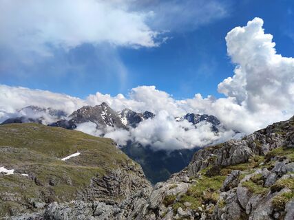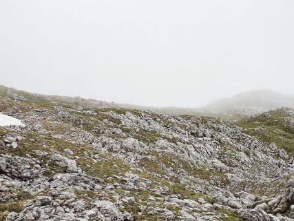 Das Felsplateau der Reiter Alm ragt auf ihrer Südostseite zu einem Grat mit mehreren Gipfeln auf, die Steil zum Hintersee runterstürzen. Wir folgen dem Grat auf ca. 2000 Höhenmetern und überwinden mehrere leichte Auf- und Abstiege. Nacheinander erreichen wir den Prünzlkopf (2082m), das Schrottmalhorn (2045m) und den Edelweißlahner (1953m). Die Orientierung im felsigen Gelände ist bei nebligen Sichtverhältnissen schwierig, man muss die Markierungen im Blick behalten. Schneefelder bleiben hier bis in den Hochsommer liegen, man muss sie mehrmals überqueren. Dafür wird man mit einem genialen Blick auf den Hintersee, den Hochkalter, Watzmann und den Hochkönig entlohnt!