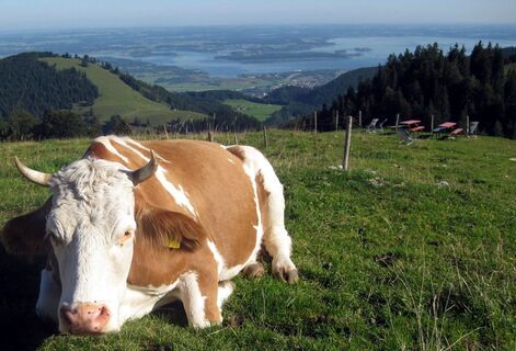 Zur Laubensteinalm wählt man vom "Paradies" aus den schmäleren Almweg. Nach gut 30 Minuten hat man das "Laubenstein-Gatterl" erreicht, das heute kein "GatterI" mehr ist sondern eine Weiderost. Bevor Sie nach links zur Laubensteinalm abbiegen, sollten Sie sich umdrehen und den Blick auf den Chiemsee genießen. Auf der Laubensteinalm waren früher 6 Almhütten. Heute betreiben noch zwei Bauern aktiv Almwirtschaft. In der oberen Hütte, dem "Marchl-Kaser" kann man im Regelfall etwas zu Trinken und kleine Brotzeiten bekommen. Auf keinen Fall darf man sich die Aussicht vom Laubensteingipfel, der sich nur wenige Höhenmeter oberhalb der Almhütten erhebt, entgehen lassen. Dort kann man auch zahlreiche versteinerte kleine Muschel- und Seelilienteile finden. In der Umgebung des Laubenstein befinden sich mehrere Höhlen: In unmittelbarer Nähe des "Gatterls" liegen die beiden größten, die "Schlüsselloch-" und die "Große Spielberghöhle". Man sollte sich jedoch hüten, als Laie und ohne spezielle Ausrüstung und Kartenmaterial, mehr als 5 bis ·10 m in die Höhlen "einzufahren", da sich im Inneren zahlreiche Gefahrenstellen wie Abstürze, Spalten, Verzweigungen und dergl. befinden und eine Bergung und Rettung äußerst schwierig ist. Außerdem ist es im Inneren der Höhlen recht feucht und kühl.