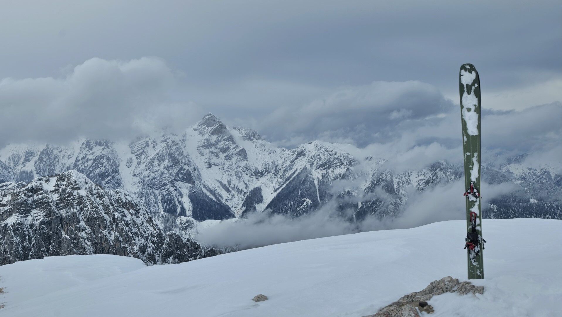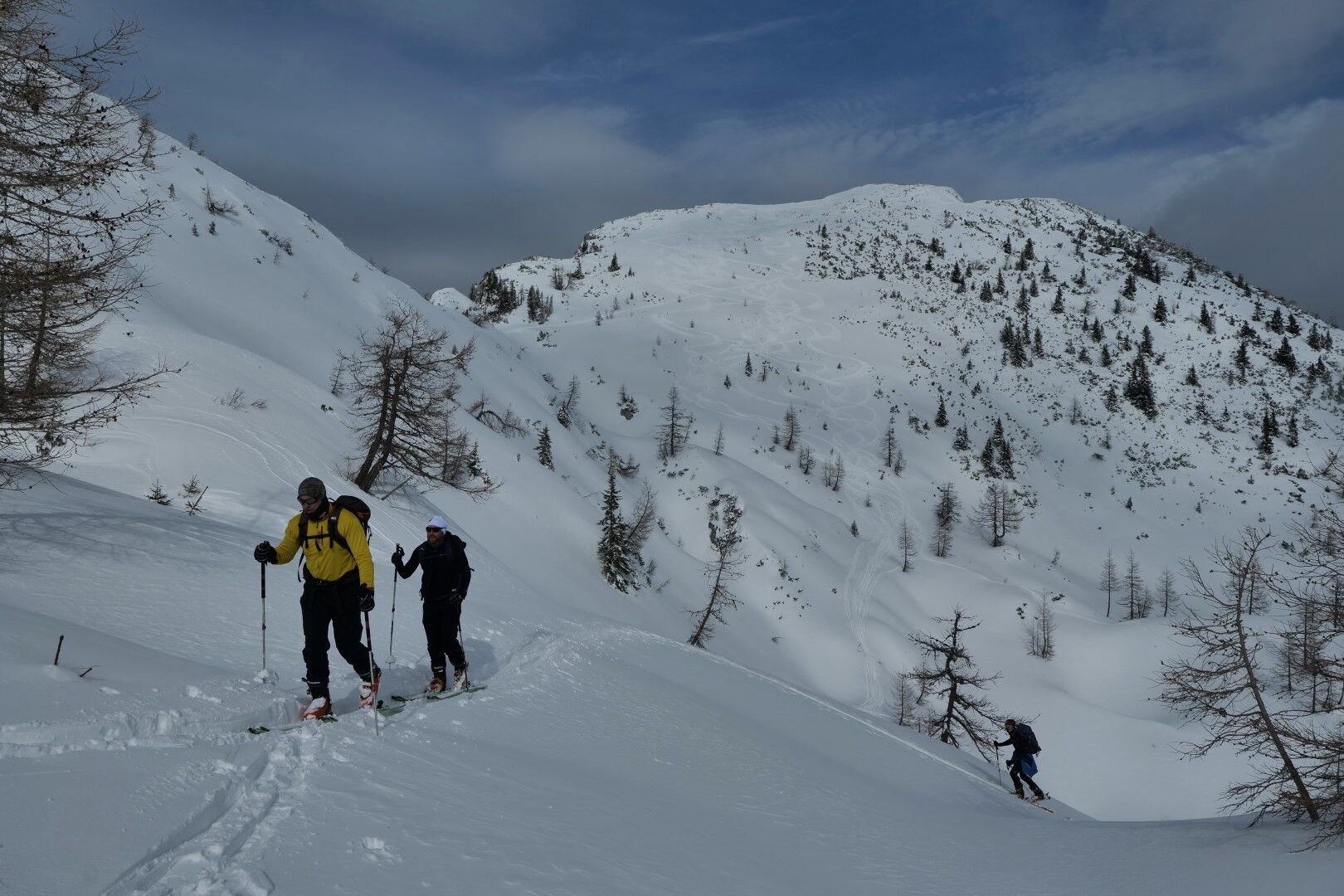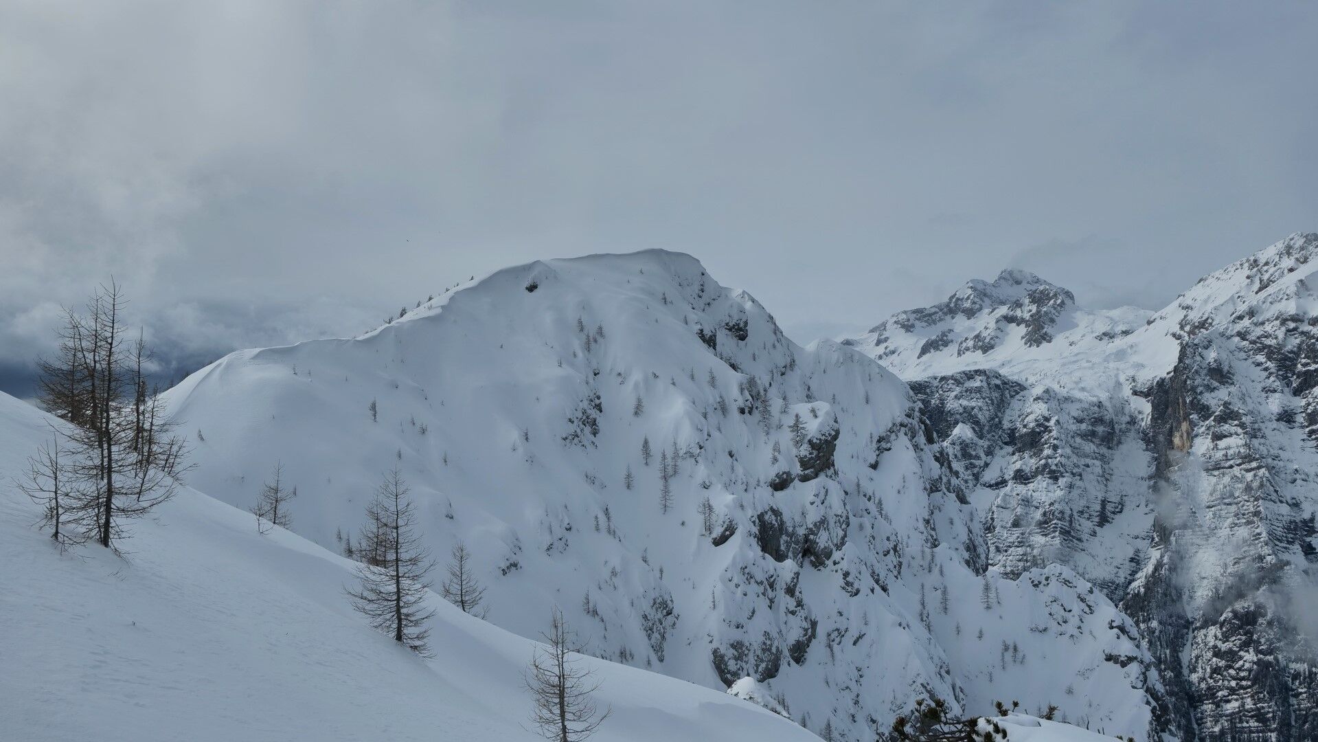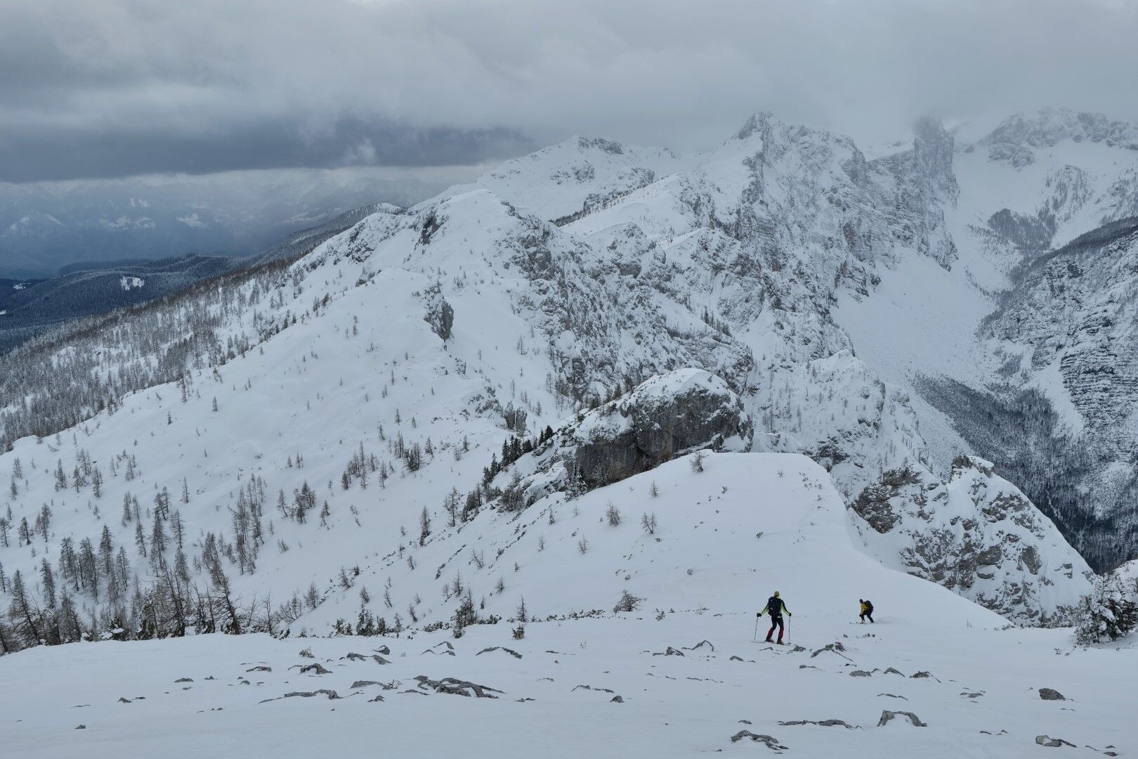 Vom Gipfel aus fahren Sie mit den Skiern in das darunter liegende Becken hinunter. Vom Becken aus steigen Sie zurück zur Kreuzung, von der aus die zwei Gipfel zu sehen waren. Anstatt in Aufstiegsrichtung zurückzukehren, geht es weiter über einen ziemlich steilen Grat zum Gipfel der Brda (2009).