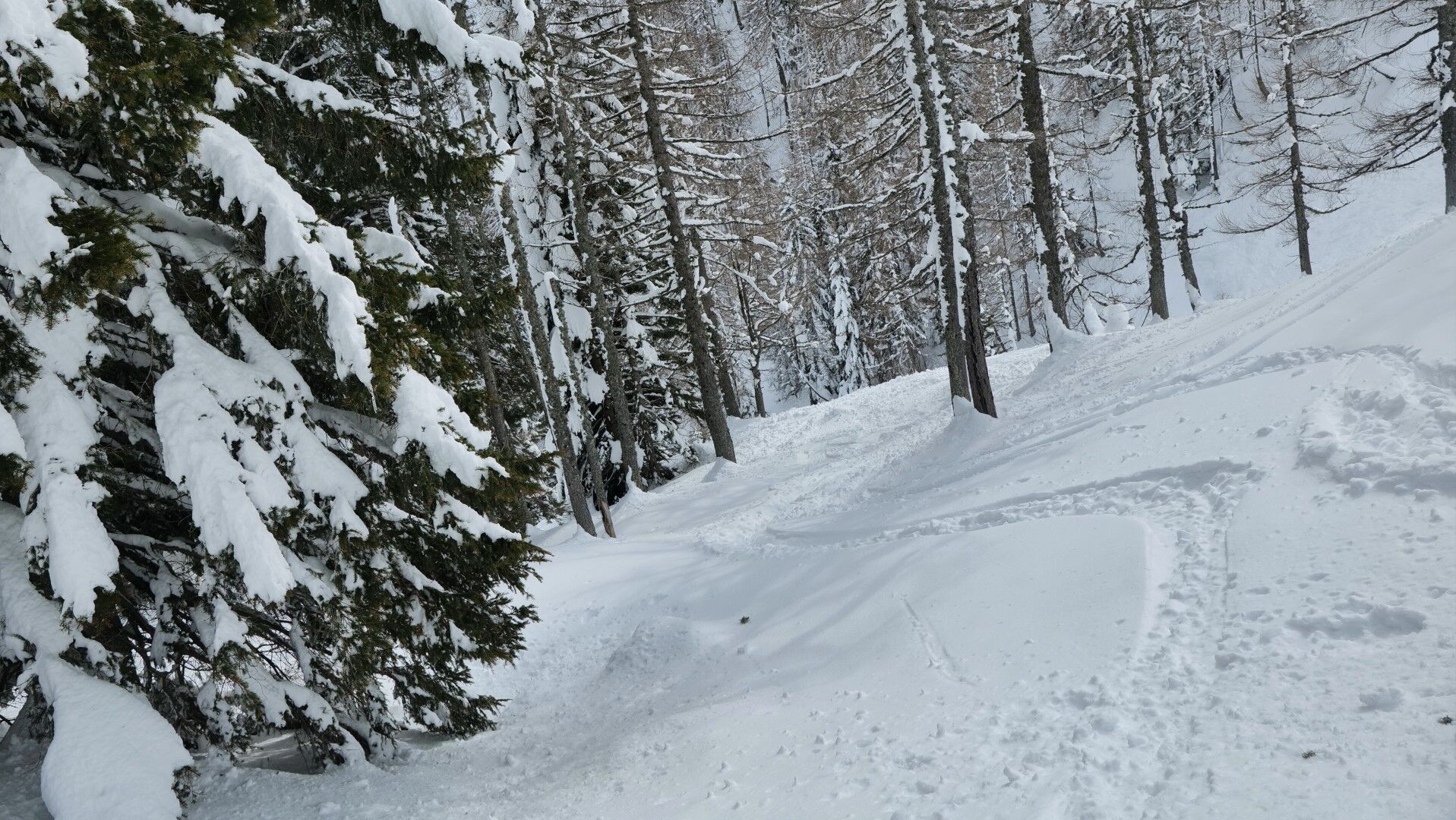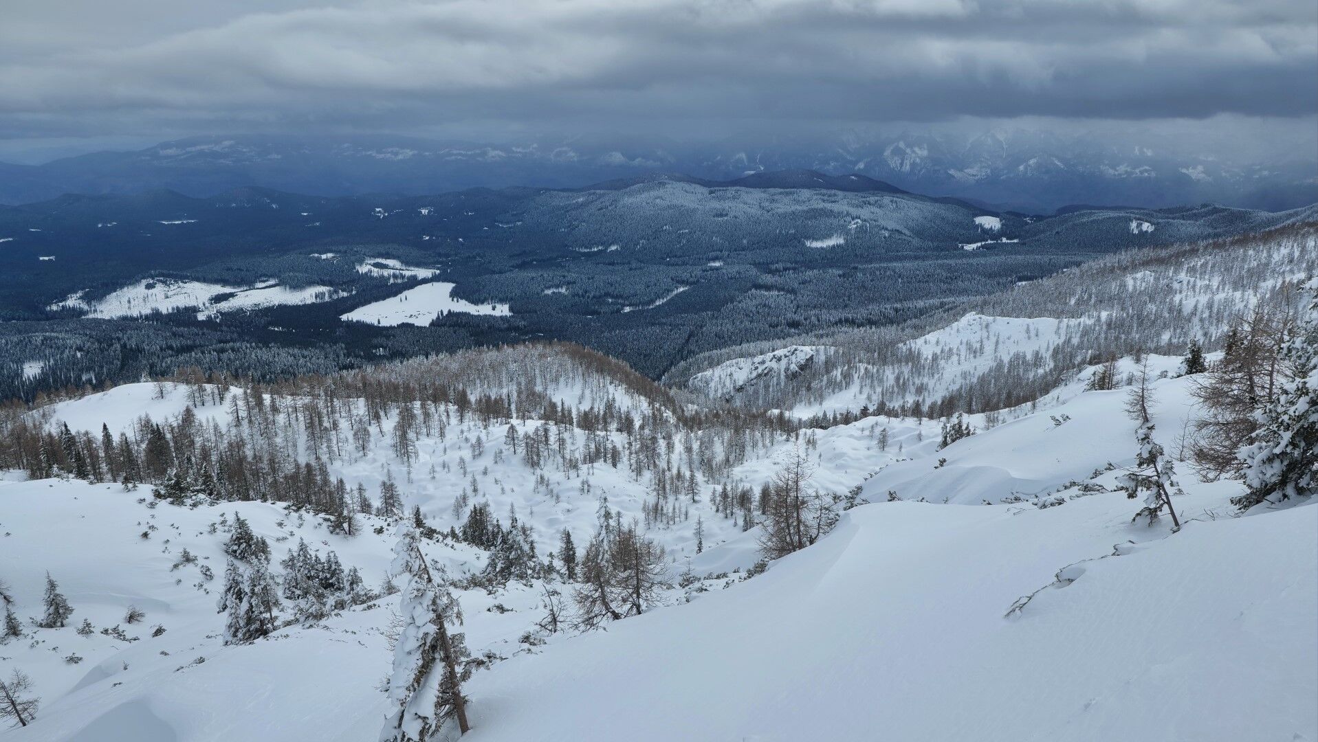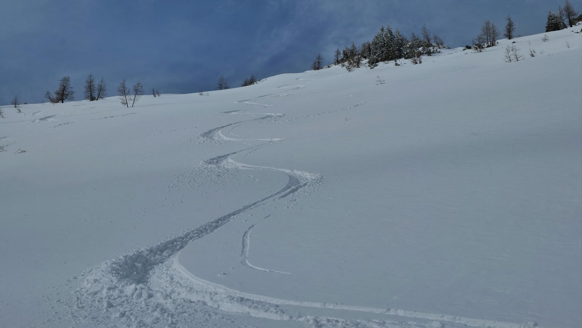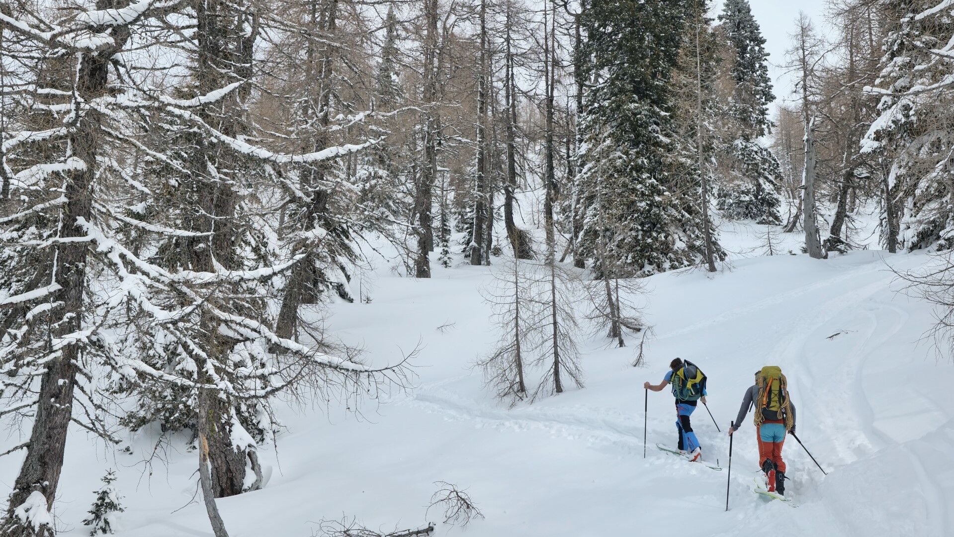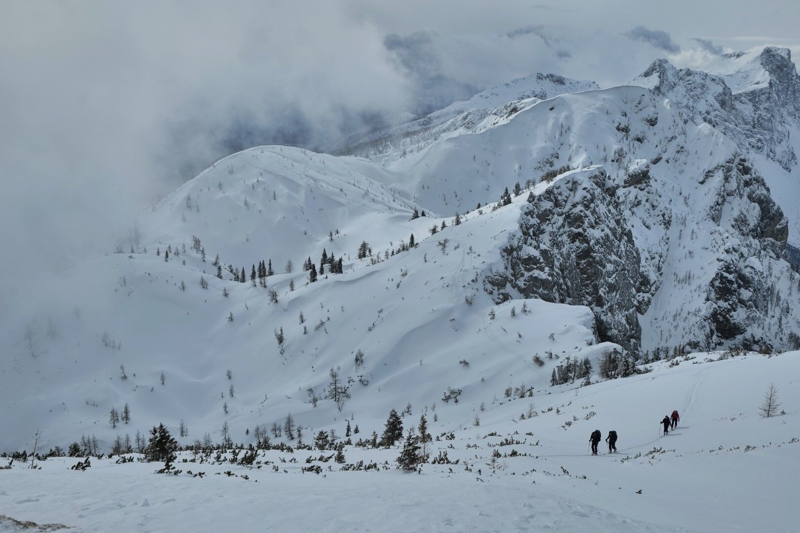 Vom Gipfel aus fahren Sie mit den Skiern in das darunter liegende Becken hinunter. Vom Becken aus steigen Sie zurück zur Kreuzung, von der aus die zwei Gipfel zu sehen waren. Anstatt in Aufstiegsrichtung zurückzukehren, geht es weiter über einen ziemlich steilen Grat zum Gipfel der Brda (2009).