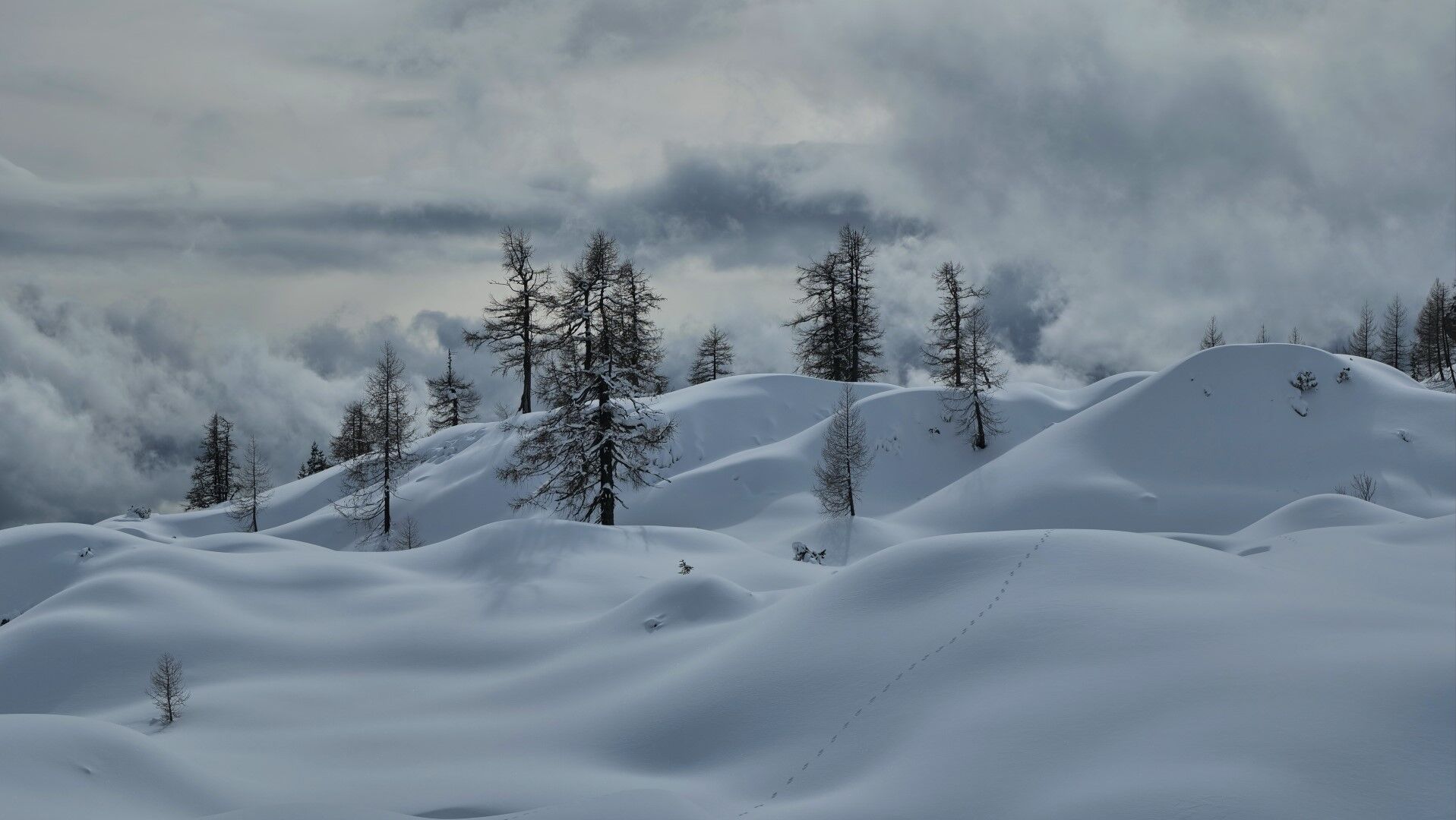 Vom Gipfel von Brda fahren Sie mit den Skiern zum ersten Sattel des Grats auf der Triglav-Seite und von dort über die offenen Hänge hinunter in die Landschaft der Karsthügel und Dolinen der Lipanca-Kette. Oberhalb eines steilen Abbruchs nehmen Sie die Route des morgendlichen Aufstiegs wieder auf. Bald darauf erblickt man die Berghütte.