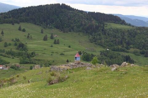 Descendre ensuite le charmant sentier qui ondule à travers les pâturages en direction de la Chapelle de la Salette que l’on aperçoit en contrebas sur son promontoire rocheux. L’endroit offre un joli point de vue sur les alentours. Cette chapelle est si petite que l’on ne peut y entrer mais elle renferme 3 statuettes de Notre-Dame de la Salette, Sainte-Sabine et Sainte-Claire. Regardez bien sous la chapelle, il y a une petite grotte ! Pratique pour s’abriter en cas de pluie ou de vent…