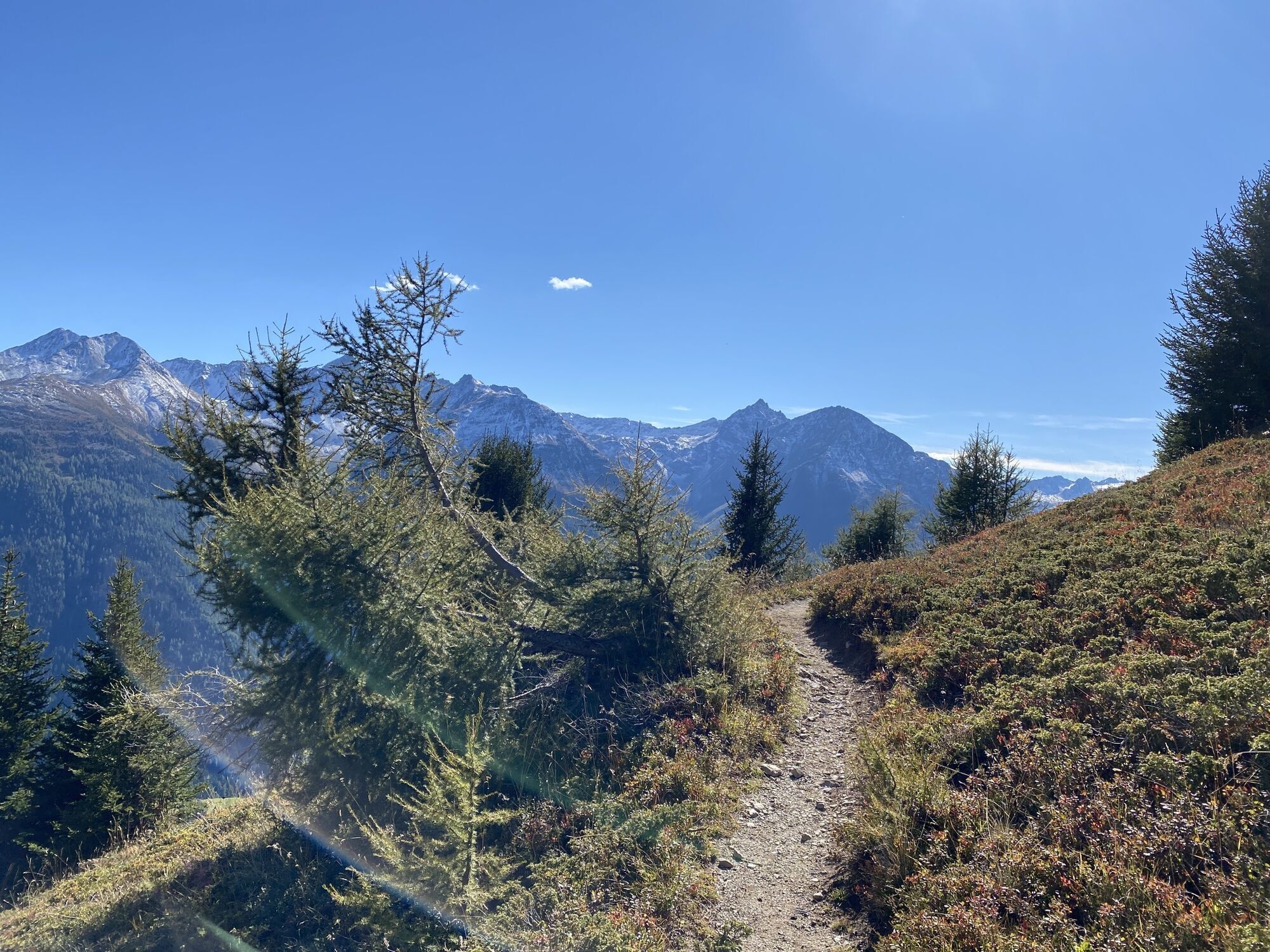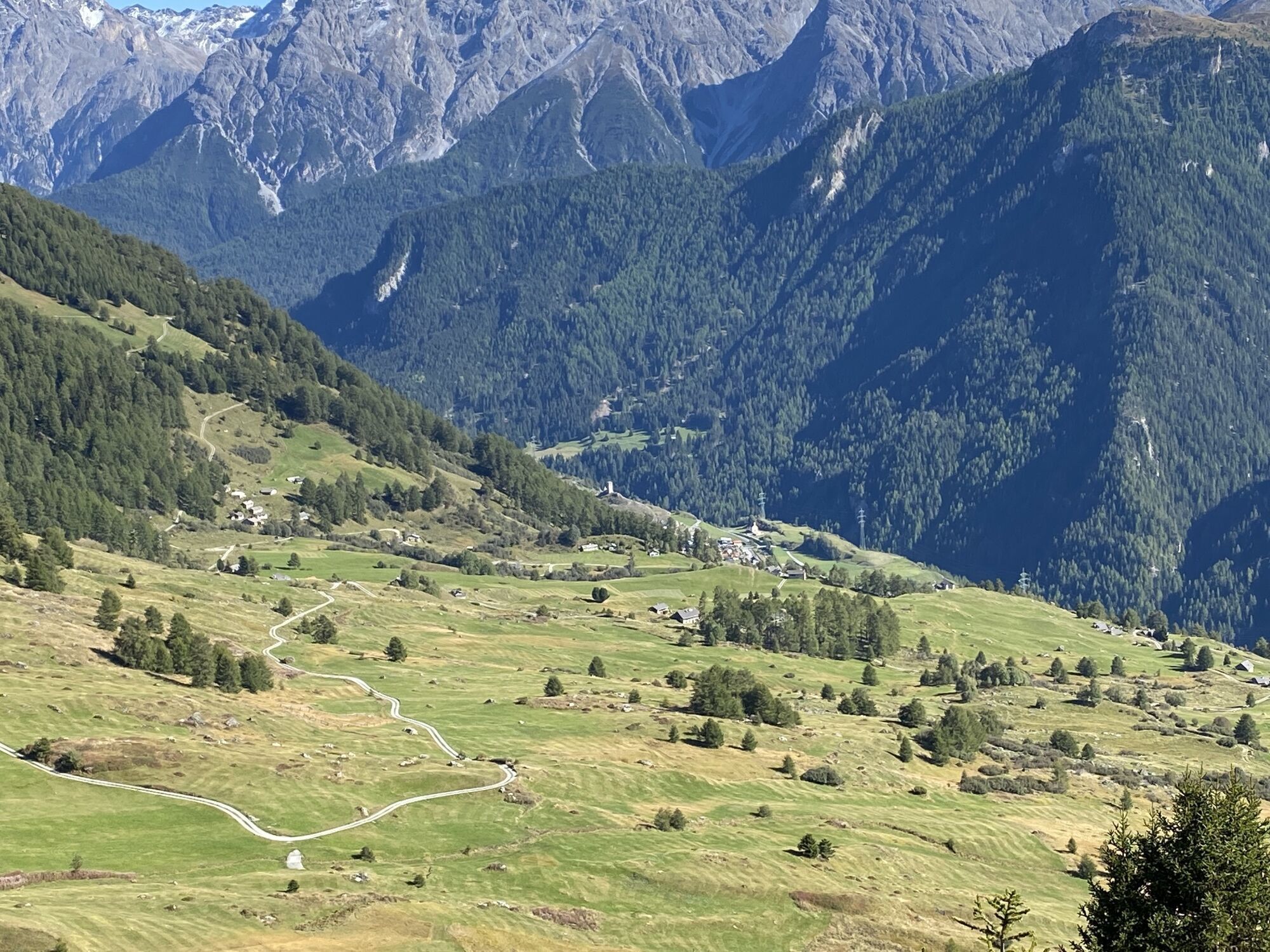 Nach der Kehre bei der nächsten Kreuzung verlassen, Richtung Chöglias und Munt