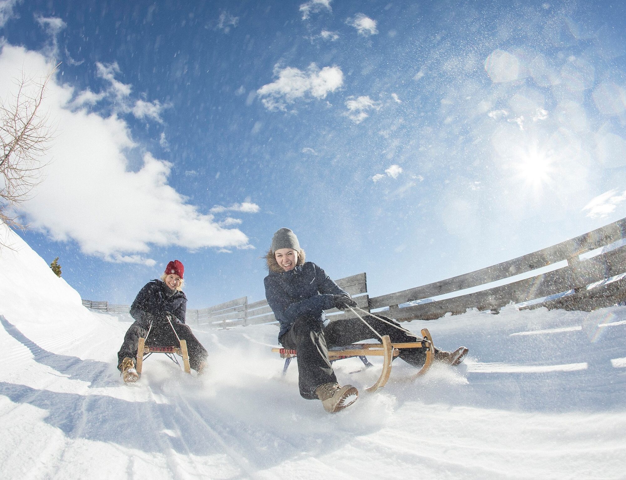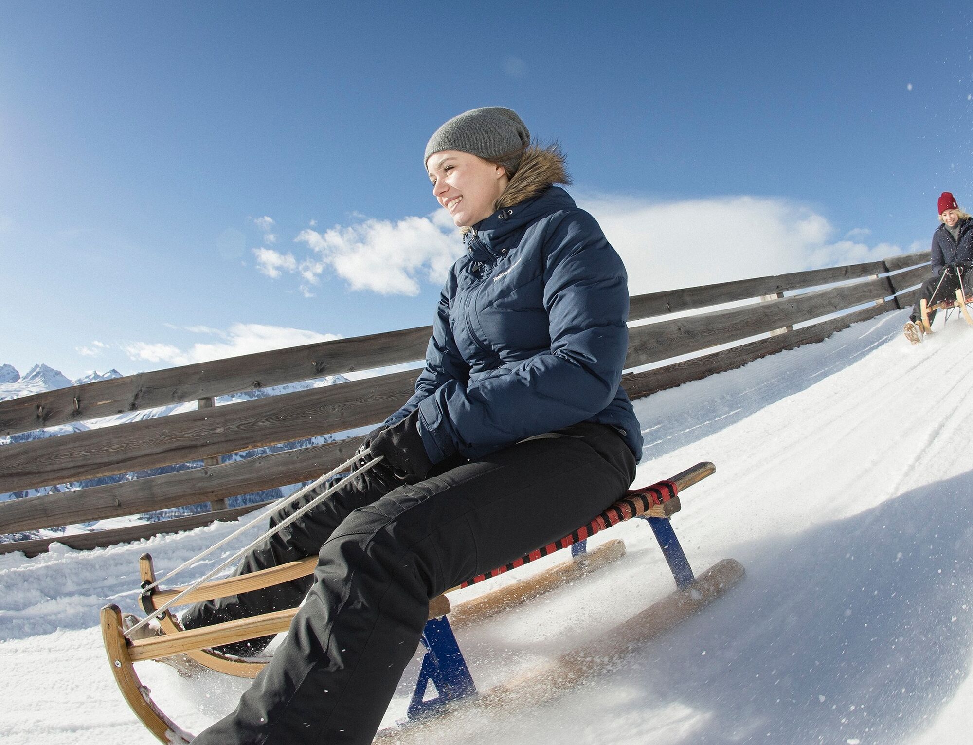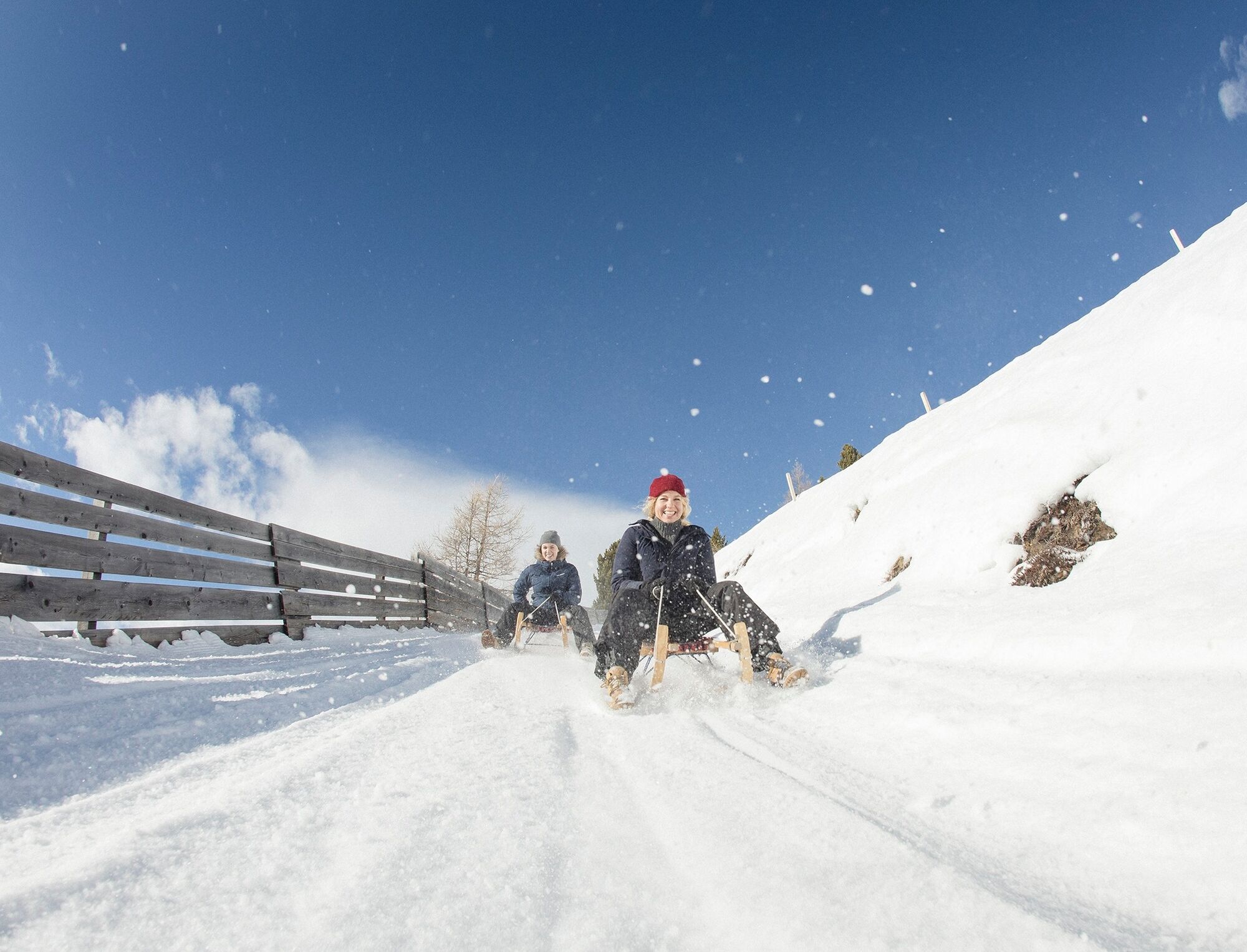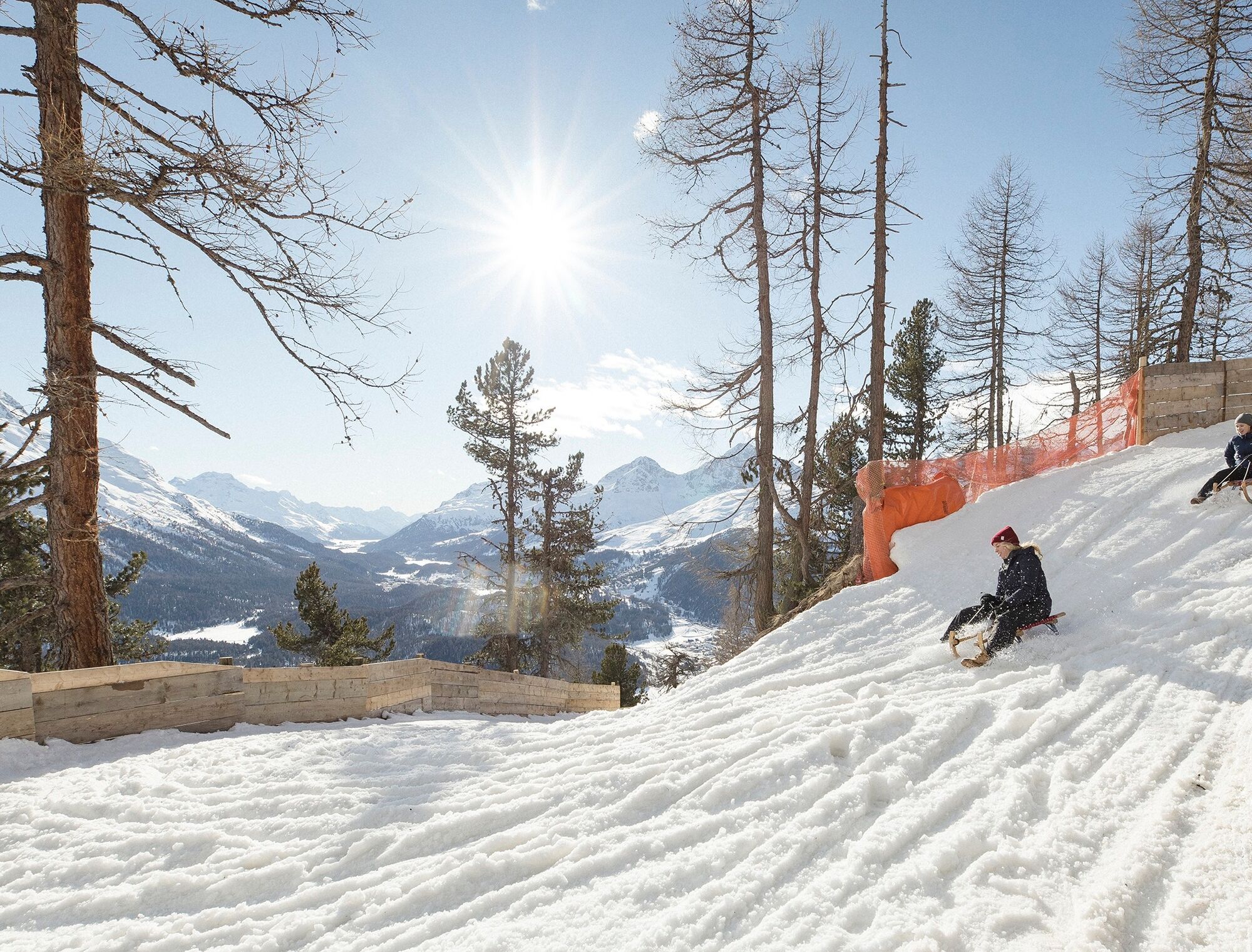 Es liegt ein Knirschen in der Luft zwischen den überzuckerten Föhren- und Lärchenbäumen: Das Knirschen stammt von Bremsmanövern, wenn es in einer Kurve mal wieder gar eng wird. Dann gilt: Schlittenschnauze...