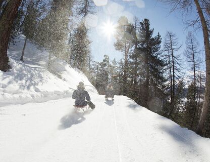 Es liegt ein Knirschen in der Luft zwischen den überzuckerten Föhren- und Lärchenbäumen: Das Knirschen stammt von Bremsmanövern, wenn es in einer Kurve mal wieder gar eng wird. Dann gilt: Schlittenschnauze anheben, Kufenenden in den Schnee bohren - und erneut Anlauf nehmen, damit sich Tempo aufbauen kann für die langen Geraden.