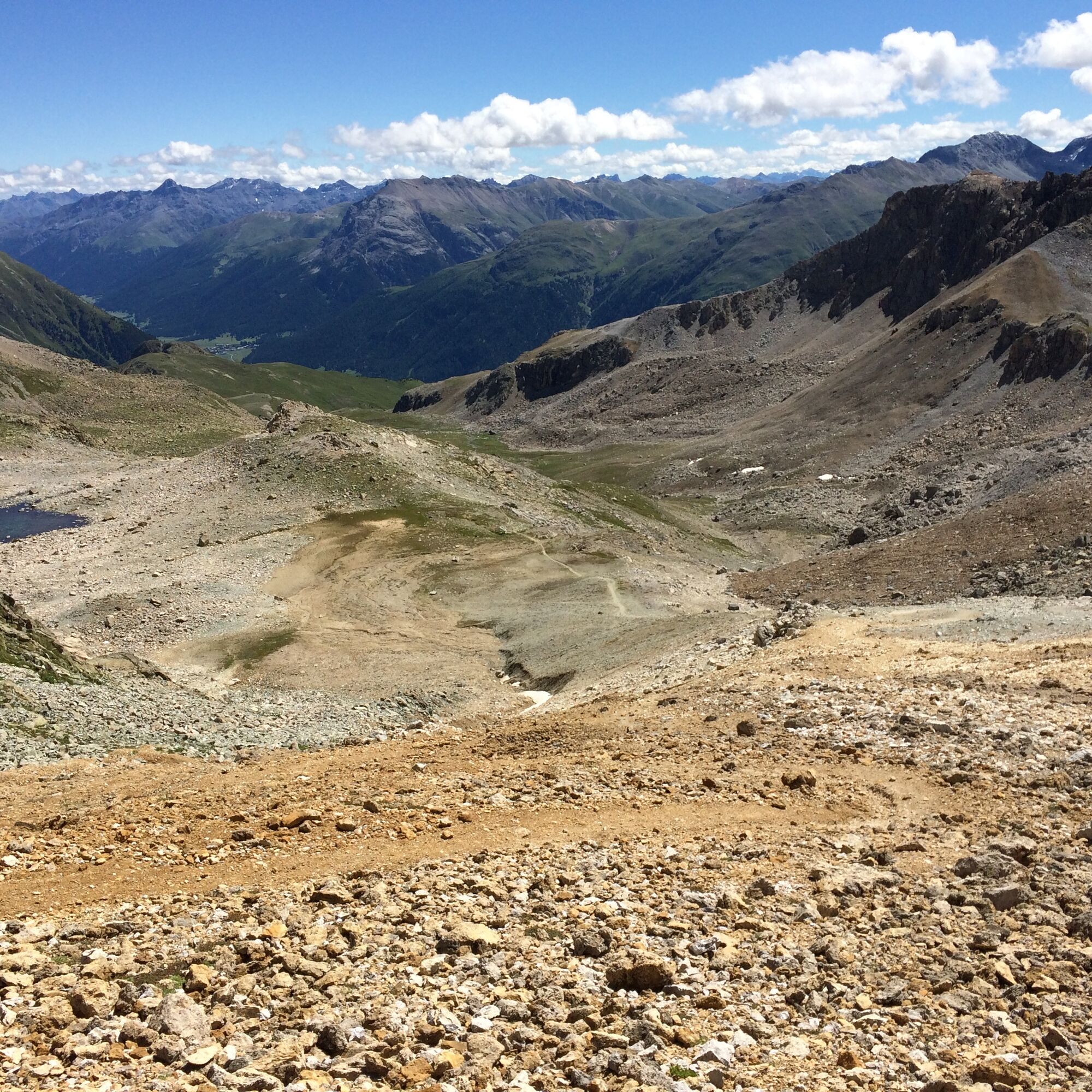 Nun beginnt der Abstieg durch die Valletta. Zu Beginn ist der Weg recht steil, doch im Talboden angekommen passieren Sie die Funtauna Fraida und der Trail wird wunderbar flach und flowig. Er führt an der Wetterstation unter Sass Alv vorbei nach Margunin, wo am Brunnen vor der Hirtenhütte das herrlich erfrischende Wasser der Funtauna Fraida gekostet werden kann. Auch von Margunin aus präsentiert sich das wunderschöne Panorama des Berninamassivs und talabwärts blicken Sie fast bis nach Zernez.