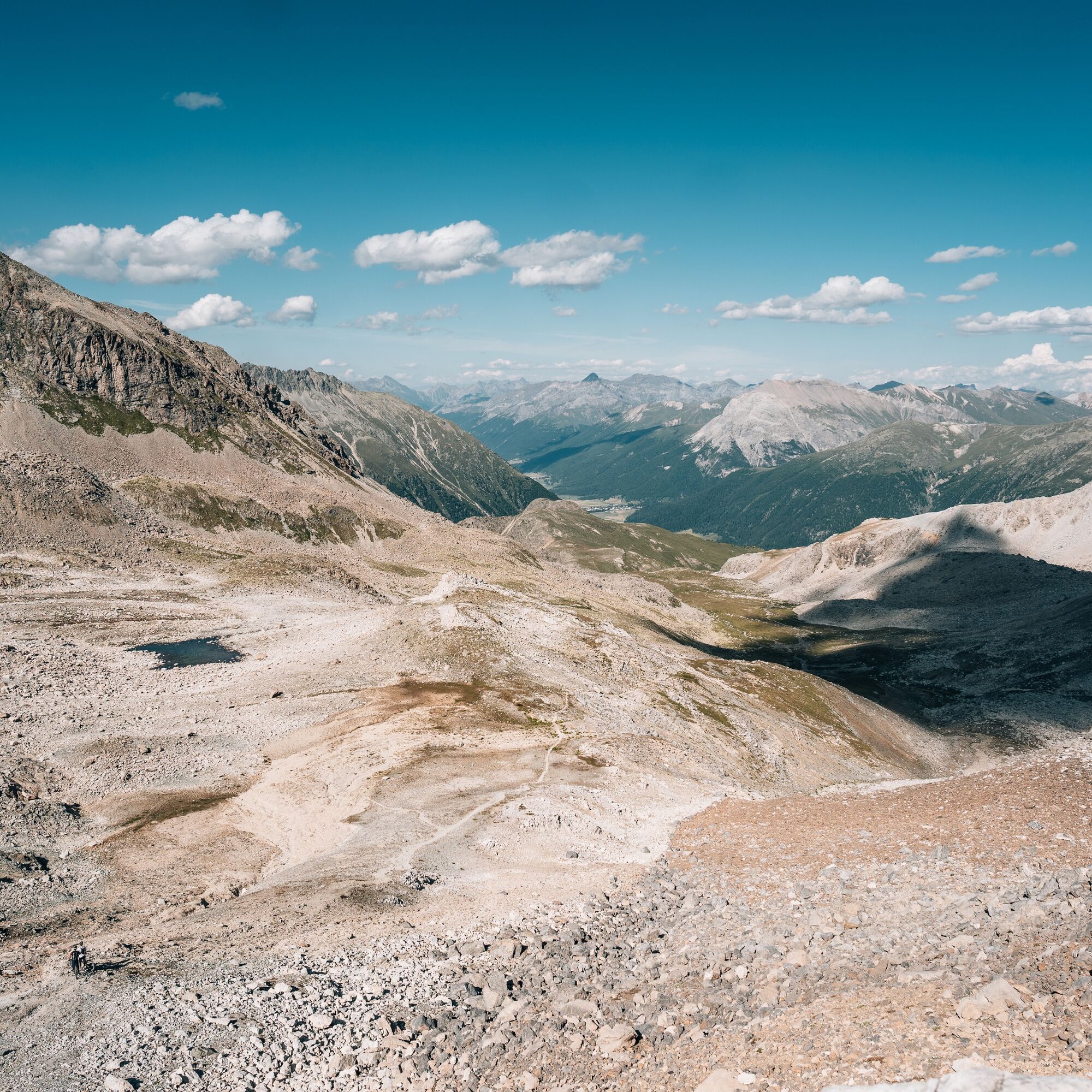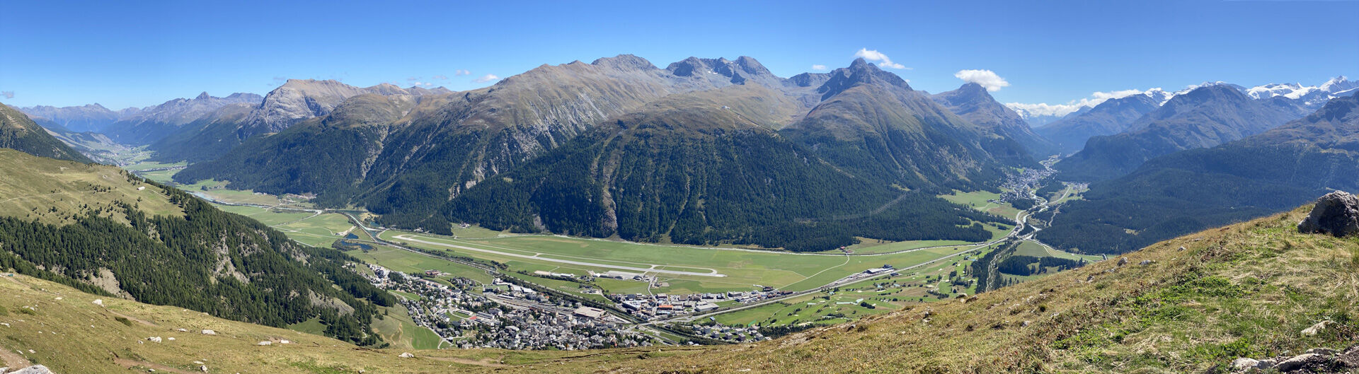 Los geht's bei der Promulins Arena in Samedan: Sie laufen nach Muntarütsch, wo mit dem Alpweg nach Alp Muntatsch der erste Aufstieg des Tages auf Sie wartet. Schon bevor Sie diese Alp erreichen, werden Sie mit der herrlichen Aussicht auf das Berninamassiv und über St. Moritz hinaus bis zum Piz da la Margna belohnt. Lassen Sie die Alp Muntatsch hinter sich, indem Sie dem relativ flachen Weg zur Alp Munt folgen. Von dort bringt Sie der Panoramatrail unterhalb des Piz Padella zum Munt da la Bês-cha da Schlarigna, wo Sie die Abzweigung nach rechts einschlagen, um nochmals einen steilen und steinigen Anstieg zu bewältigen. Die charakteristischen drei Bergzacken von Trais Fluors immer vor Augen streben Sie über Selin der Sessellift-Bergstation von Trais Fluors entgegen. Von hier ist der Kulminationspunkt des Trails, die Fuorcla Valletta, nur noch ca. 100 Höhenmeter entfernt und Sie erreichen diesen Höhepunkt nach der Traversierung einer steinigen Halde. Auf der Fuorcla Valletta öffnet sich der Blick zur Valletta da Samedan, dem kleinen Tal zwischen dem markanten Piz Ot und dem Samedner Hausberg Piz Padella, welcher von hinten jedoch nicht so schön anzusehen ist wie von Samedan aus.