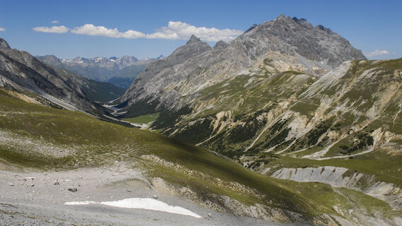 Der Weg in Richtung Osten würde zum Aussichtspunkt Margunet führen, unsere Route wendet sich aber nach Norden und mutiert zum Zickzackweg, der über blumenreiche Weiden führt und in kurzer Zeit 400 Höhenmeter überwindet. Je höher der Weg steigt, desto grandioser wird die Aussicht, die im Süden bis zum Bernina-Massiv reicht und im Osten den Ortler und das Stilfserjoch erkennen lässt. Kurz vor der Fuorcla ist neben dem Weg eine kreisrunde Doline zu erkennen, ein Trichter, der entsteht, wenn das Gestein im Untergrund ausgewaschen wird und die so entstandenen Hohlräume einstürzen.