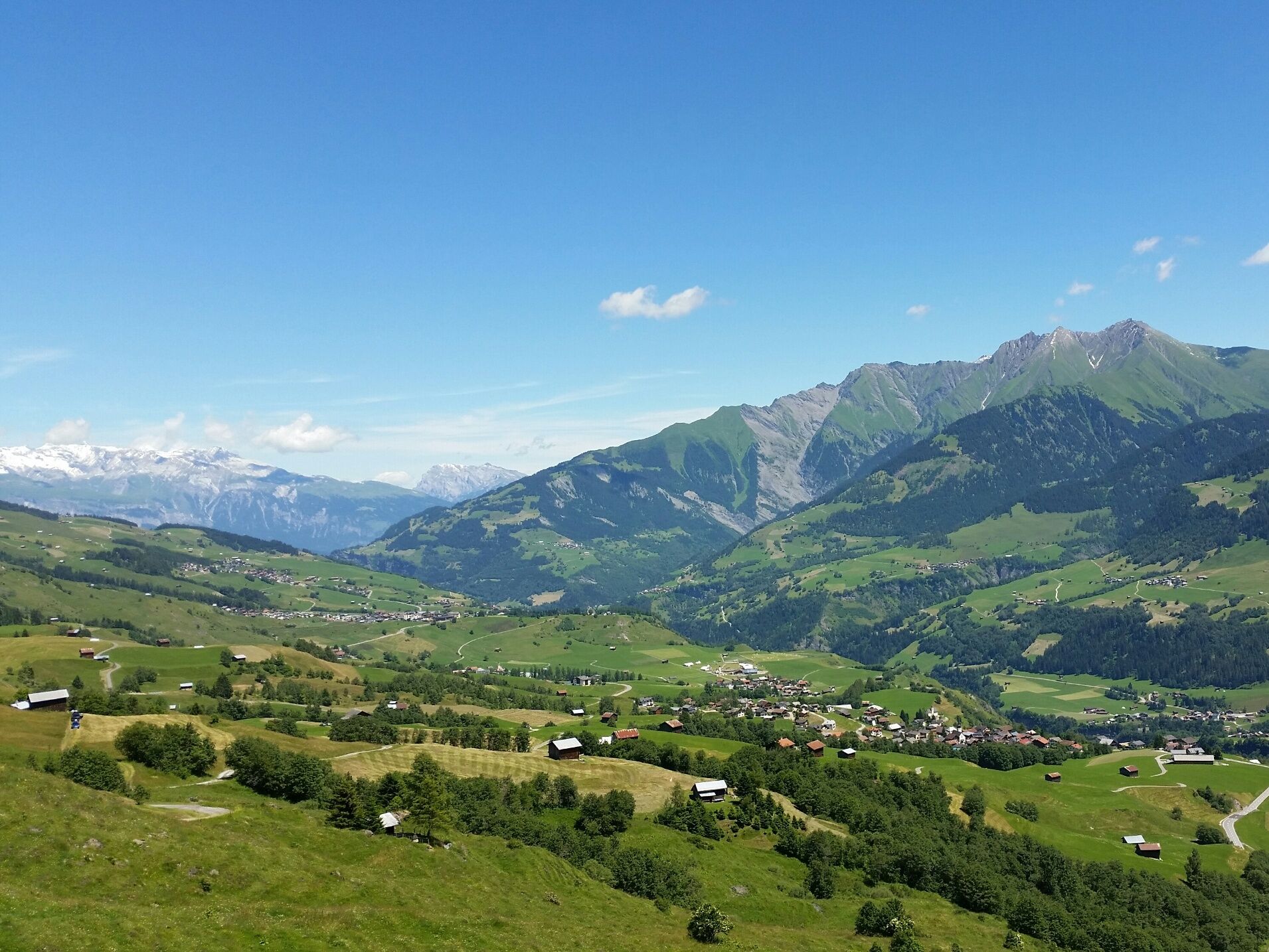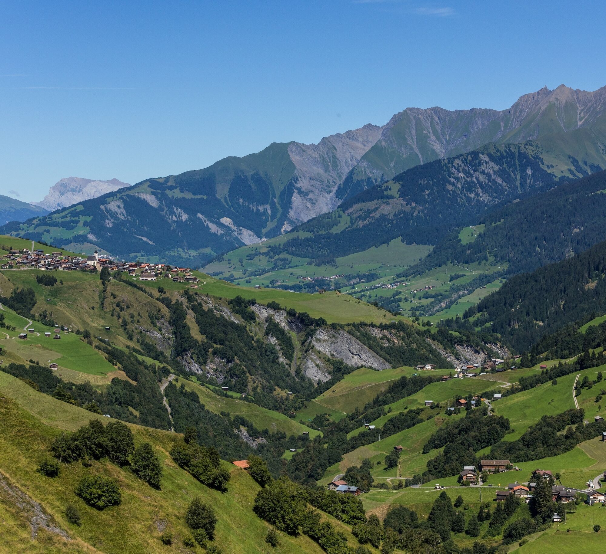 In Morissen lohnt sich ein Marschhalt, um die schönen Holzhäuser zu bewundern. Auf einem Flurweg geht es nachher in einer grossen Schlaufe abwärts bis zu den Heuställen von Scansins. Zuerst durch Wald, dann durch Mähwiesen und sumpfiges Gelände, öffnet sich der Blick in die Gruob, wo sich nach dem Flimser Bergsturz einst der Ilanzer See aufgestaut hatte. Im schmucken Dorf Luven gönnen wir uns einen Blick auf die gegenüber liegende Bergkette des Piz Signina und Piz Fess. Weiter geht's durch den Wald mit seinen imposanten Buchen und Bergahornen, vorbei an der Kirche Sogn Martin hinunter nach Ilanz, der ersten Stadt am Rhein.