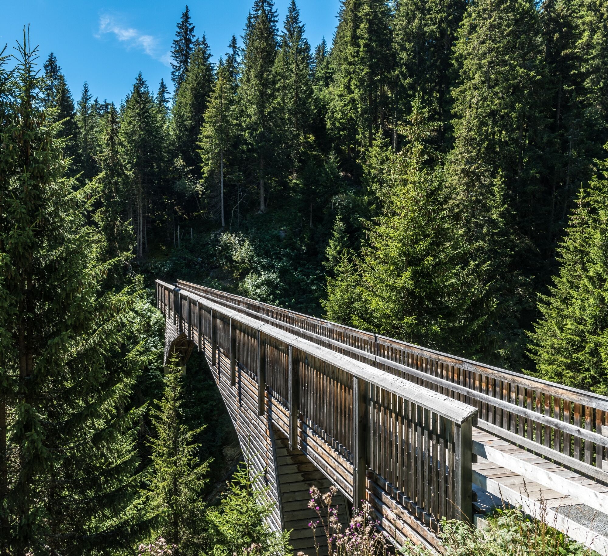 Nach einem empfehlenswerten Dorfrundgang in Vrin beginnt die Wanderung in Richtung Lumbrein. Die ersten 300 Meter geht es entlang der wenig befahrenen Kantonsstrasse. In Mons, kurz nach einer 90° Kurve, zweigt der Wanderweg in Richtung Lumbrein ab. Der schmale Pfad führt durch wüchsigen Fichtenwald mit üppiger Bodenvegetation zur Val Miedra und zu den Maiensässen oberhalb Nussaus. Nach einem kurzen Aufstieg gelangt man auf einen Panoramaweg mit herrlicher Aussicht auf Lumbrein. Die Holzbrücke über die Val da Mulin gilt zweifellos als eine der grössten Attraktivitäten des Wandertourismus in der Val Lumnezia. Der Höhenweg führt über zahlreiche Maiensässe mit sorgsam gepflegten Heuwiesen und Weiden.