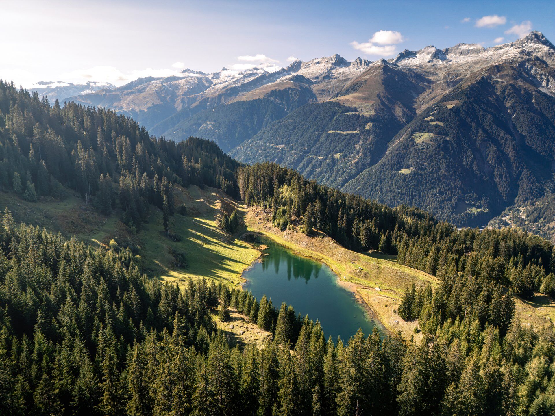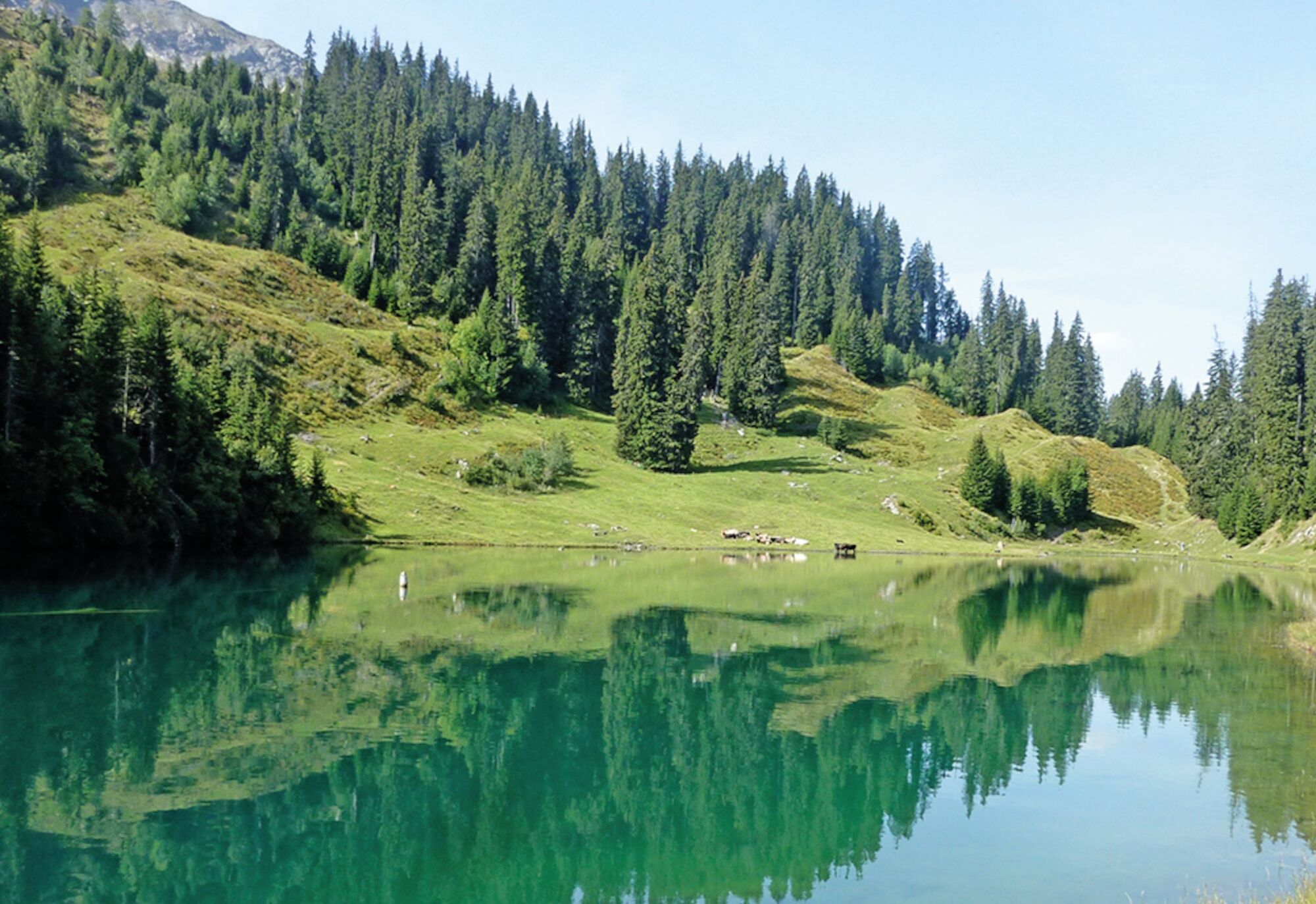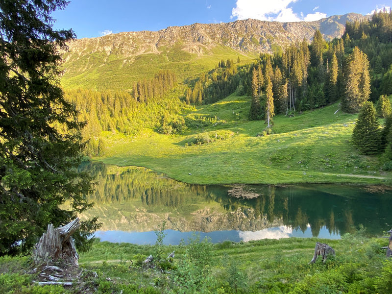Oberhalb des kleinen Dörfchens Laus beginnt die Wanderung auf breiten Wegen in Richtung Lag da Laus. Es geht stetig bergauf, vorbei an Ställen und blumenreichen Wiesen. Im Rücken wird die Sicht in die umliegende Bergwelt immer schöner und grossartiger. Der Lag da Laus selbst liegt eingebettet in einem idyllischen Bergwald und Weidelandschaft - eine Szenerie wie aus einem Bilderbuch. Weit oben, hinter dem Bergsee, befindet sich der Bergrücken der Alp da Laus und die Felsen von Garveras.