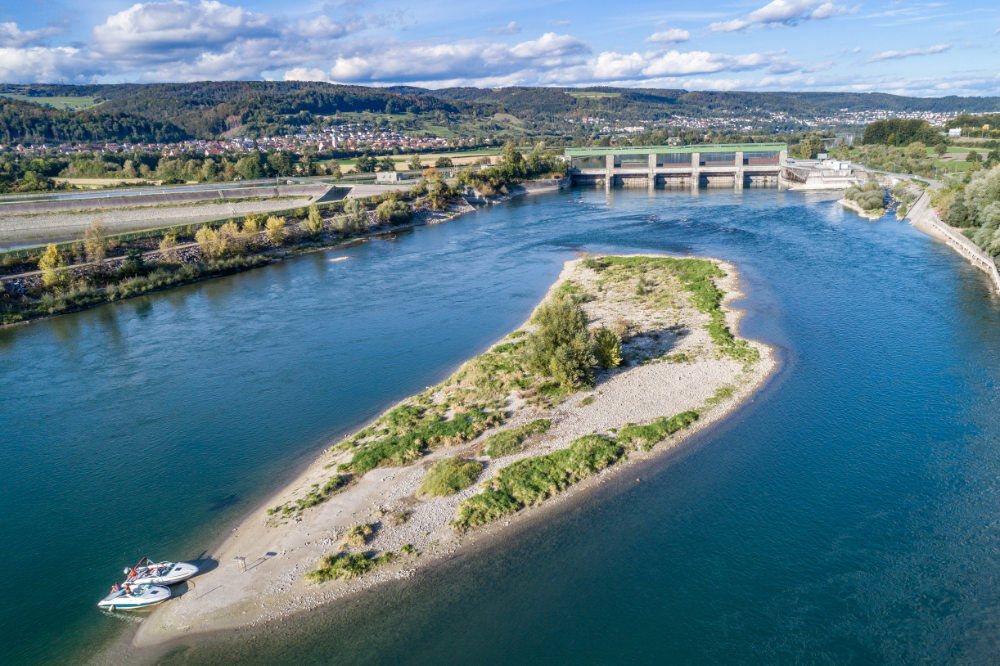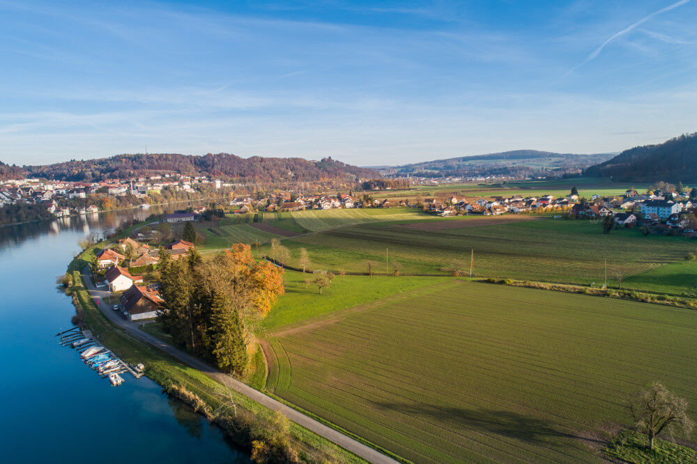 Schwaderloch: Dass die Gegend zu Zeiten von Kolumban bereits besiedelt war, belegt eine in Stein gehauene Inschrift, die besagt, dass hier zur Zeit des Kaisers Valentinian (364-375 n. Chr.) römische Burgen zum Schutz gegen Einfälle der Alemannen bestanden. Beim Bau der Eisenbahnlinie fand man diese Inschrift. Einige Ruinen sind noch zu sehen. Leibstadt-Bernau: Zwei Sehenswürdigkeiten: die Loretokapelle und das Rettich-Haus. Die Loretokapelle wurde in der Mitte des 17. Jh errichtet und diente anschliessend während Jahren als Grablege der Industriellen-Familie Von Roll. Das Rettich-Haus wurde 1697 errichtet. Das seinerzeit mit Stroh bedeckte Bauernhaus wurde 1997 restauriert Die Wasserdampffahne des AKW Leibstadt ist nicht zu übersehen. Ein Sechstel des schweizerischen Strombedarfs wird durch dieses Kraftwerk gedeckt. Es kann besichtigt werden. In Full verband früher eine Fähre die beiden Rheinufer. Nach dem Rückzug der Römer um 400 übernahmen die Alemannen die Herrschaft und siedelten hier, als Kolumban vorbeizog. Erwähnenswert ist hier auch das schweizerische Militärmuseum Full (liegt direkt am Weg) und das Festungsmuseum Reuenthal, das besichtigt werden kann (benötigt ab Full einen kleinen Aufstieg nach Reuenthal). Von dort führt ein direkter Weg nach Koblenz. Reuenthal hat seine Wurzeln bei den Helvetiern, die 500 v. Chr. dieses Gebiet in Besitz nahmen. Von 58 v. Chr. bis ca 400 n. Chr., mit einem kurzen Unterbruch von 259 bis 277 n. Chr. als die Alemannen hier lebten, hielten die Römer das Gebiet besetzt. Die Alemannen übernahmen dann die Herrschaft wieder nach dem Rückzug der Römer über die Alpen. Zwischen Ziegelhütte und Giriz überqueren wir den Fluss Aare und gelangen nach Koblenz. Koblenz, das Dorf der vier Brücken beim Zusammenfluss von Rhein und Aare, ist heutiger Etappenort. Das Gebiet ist seit der Römerzeit besiedelt. Etwas östlich von Koblenz sind die Grundmauern eines römischen Wachtturms aus dem Jahre 371 n. Chr. erhalten. Im Rhein lag früher die Insel Judenäule, lange Zeit für die Juden in der Schweiz die einzige erlaubte Bestattungsstätte und bei den häufigen Verfolgungen auch der einzige Zufluchtsort. Bei Hochwasser wurde die Insel regelmässig überschwemmt.