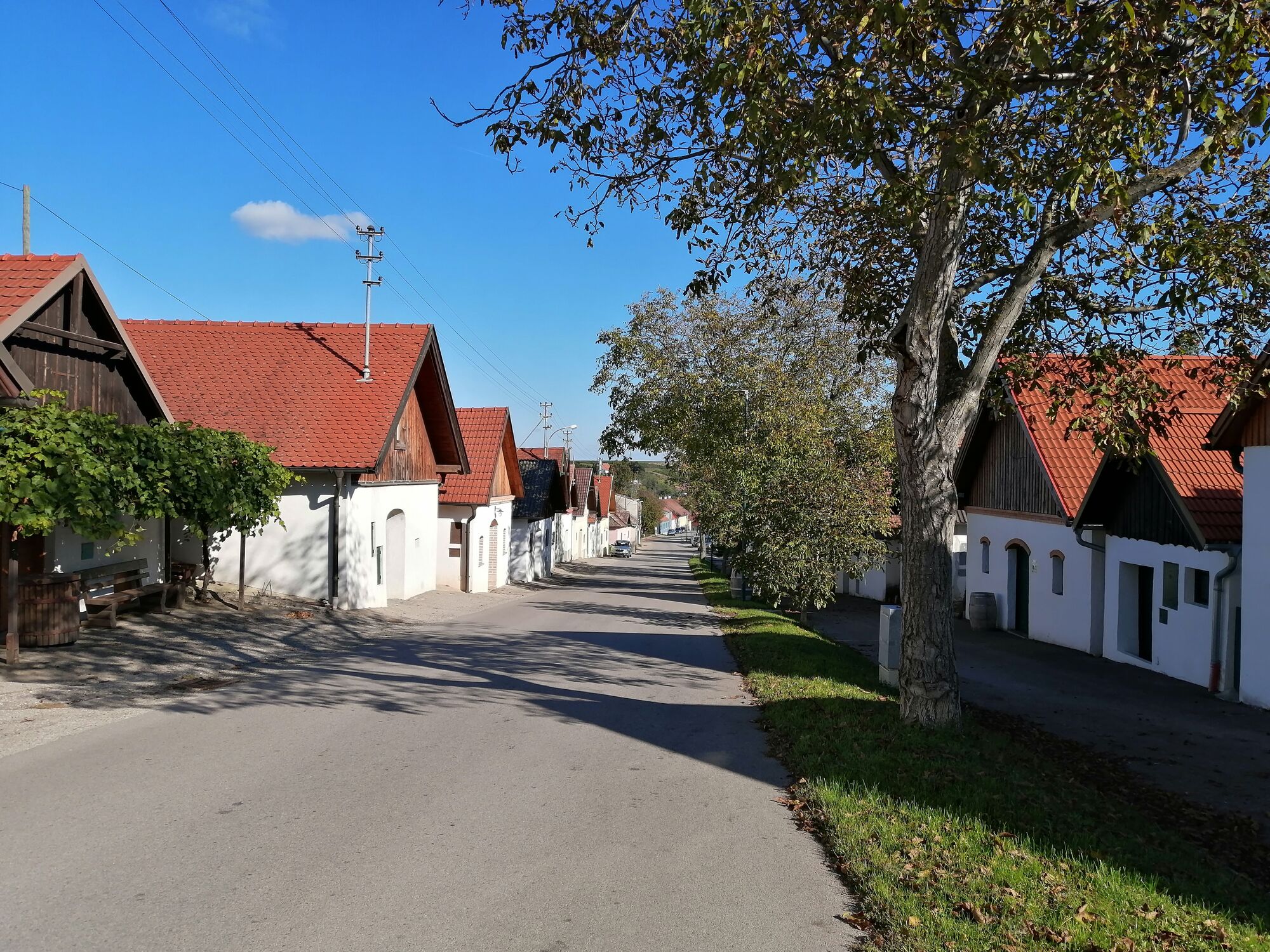 Nach einer Linkskurve geht es wieder bergab nach Mailberg, durch die Kellergasse "Marktweg" mit Presshäusern.