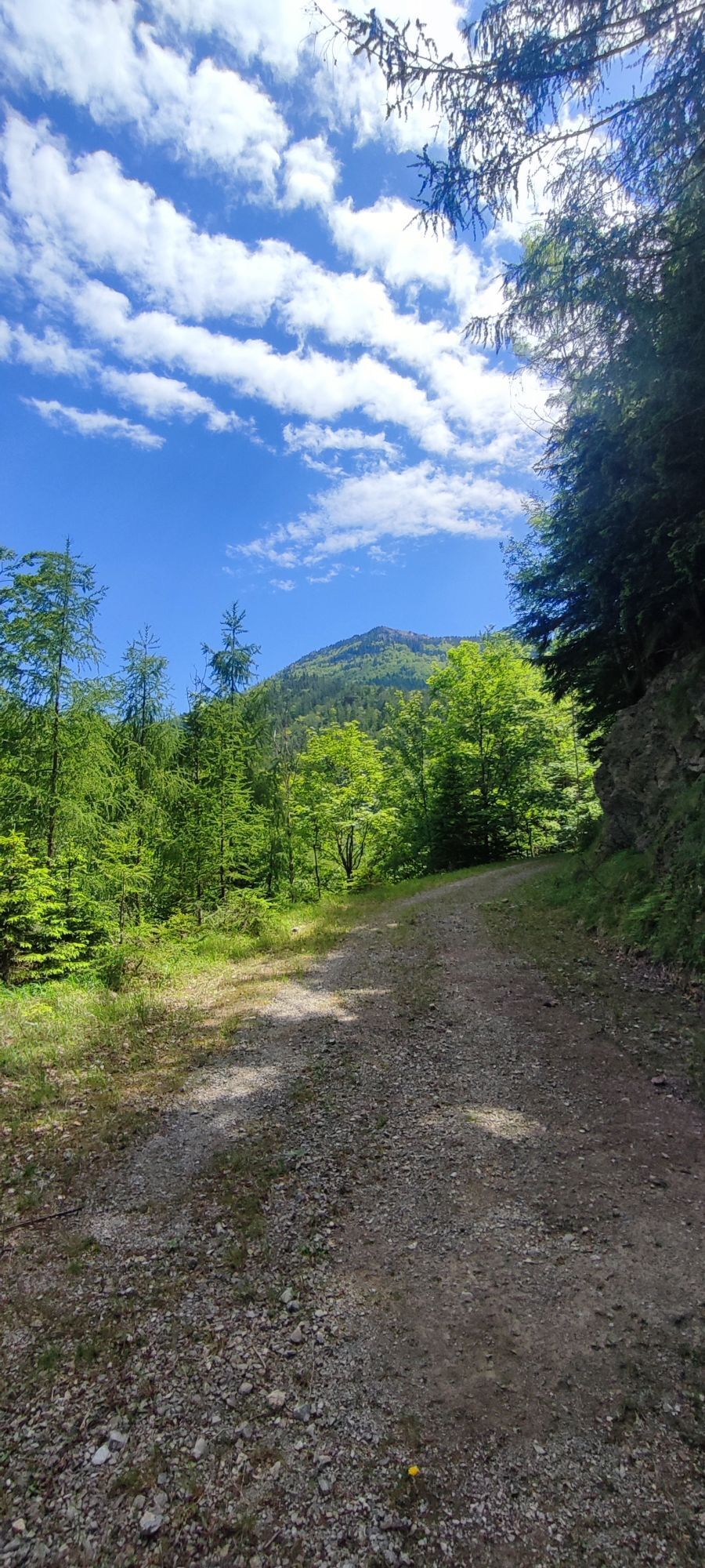 Vom beschilderten Parkplatz die Asphaltstraße entlang, bevor man links auf die Forststraße abzweigt. Nach ca 1km geht es bei der Abzweigung links weiter hinauf Richtung Ebenwaldhöhe.