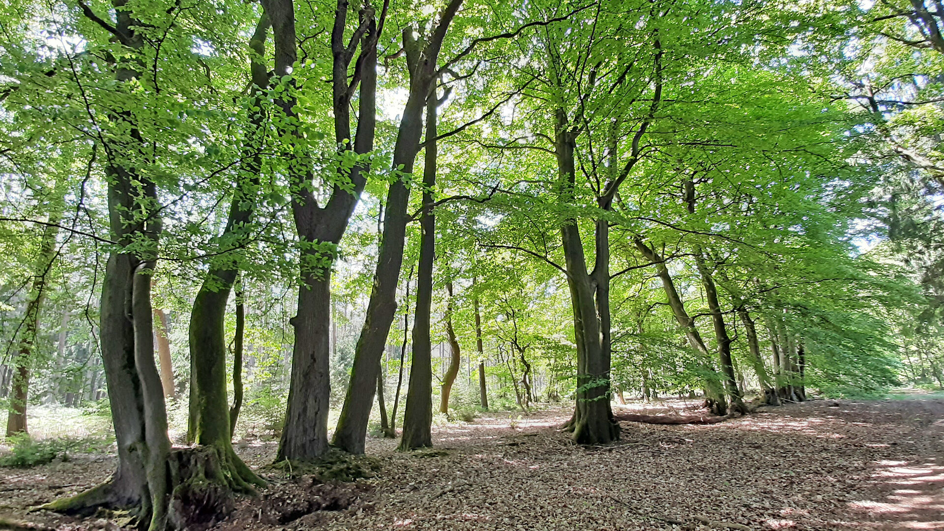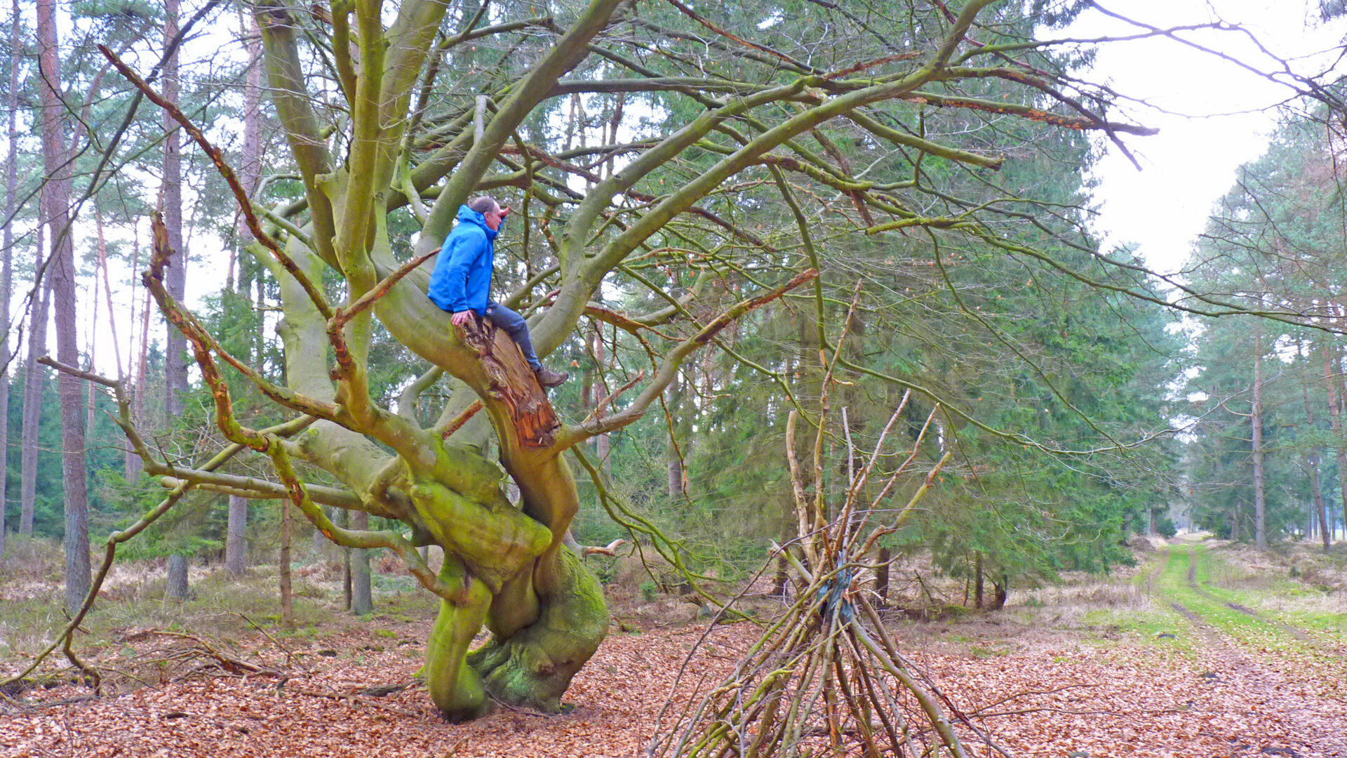 Wenngleich im Wald das Nadelholz der Fichte deutlich überwiegt, stehen am am Waldrand Hinzel vermehrt mächtige und tief beastete Buchen. Heute ist es besonders in ausgeprägten Nadelwäldern das erklärte Ziel der Niedersächsischen Forstämter, den Laubholzanteil zu erhöhen. Gerade im Frühjahr sind die Forstwirte unterwegs, um diesbezügliche Pflanzarbeiten vorzunehmen. Kurz bevor wir den Wald verlassen, befindet sich an einem spannenden "Kletterbaum" ein kleiner Rastplatz mit Tisch und Bank.