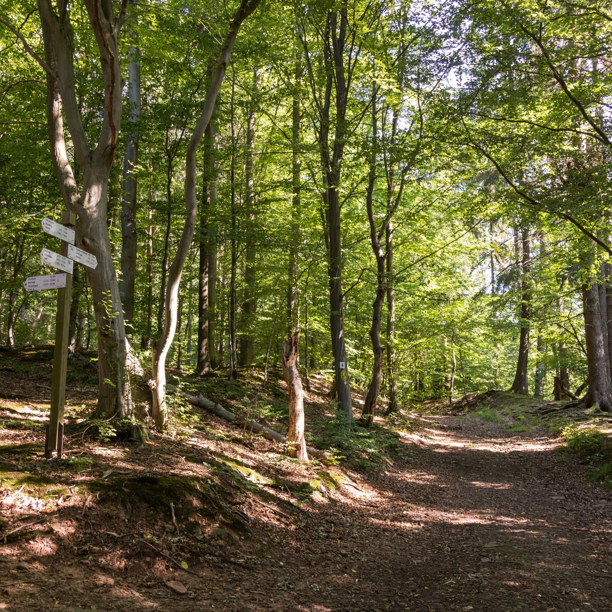 Über den Panoramaweg (Kennzeichnung „Auge“), der an vielen Stellen einen herrlichen Ausblick auf die Stadt mit ihrem Naturpark bietet, kommen Sie zu unserem Ausgangspunkt zurück.