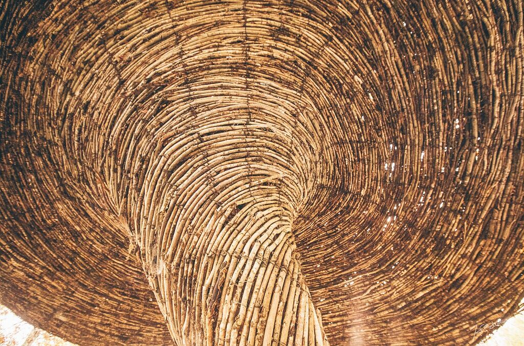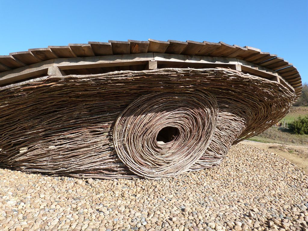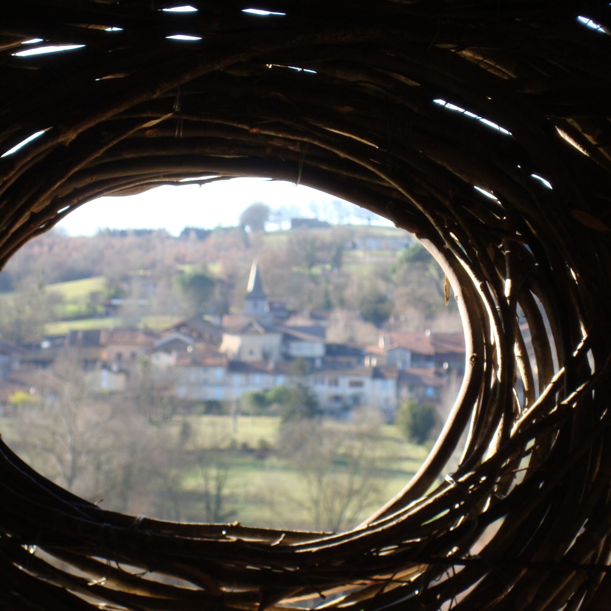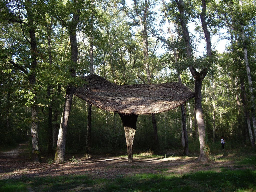 In Saint-Elix d'Astarac: das Werk "Kazé" von Teruhisa Suzuki. Kazé bedeutet Wind auf Japanisch. Diese imposante Skulptur aus geflochtenen Zweigen erinnert an einen in Wäldern gefangenen Wirbelsturm. Leicht und majestätisch symbolisiert sie die Kraft und Macht des Windes. Ganz in der Nähe lädt eine Lichtung mit einer prächtigen dreihundertjährigen Eiche zum Verweilen und Träumen ein.