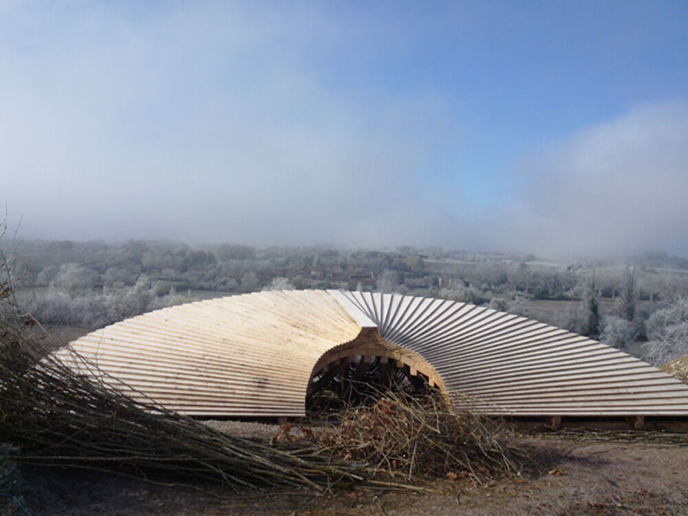 In Villefranche: das Werk "Yané", was auf Japanisch „Dach“ bedeutet. Ein großer Fächer aus hellem Holz, der an einem Hang liegt, das monumentale Werk zeigt sich entlang eines Wanderwegs, der das Dorf Villefranche umschließt. Dieses schützende Dach lädt ein, die Landschaften rundherum aus einer anderen Perspektive zu betrachten.