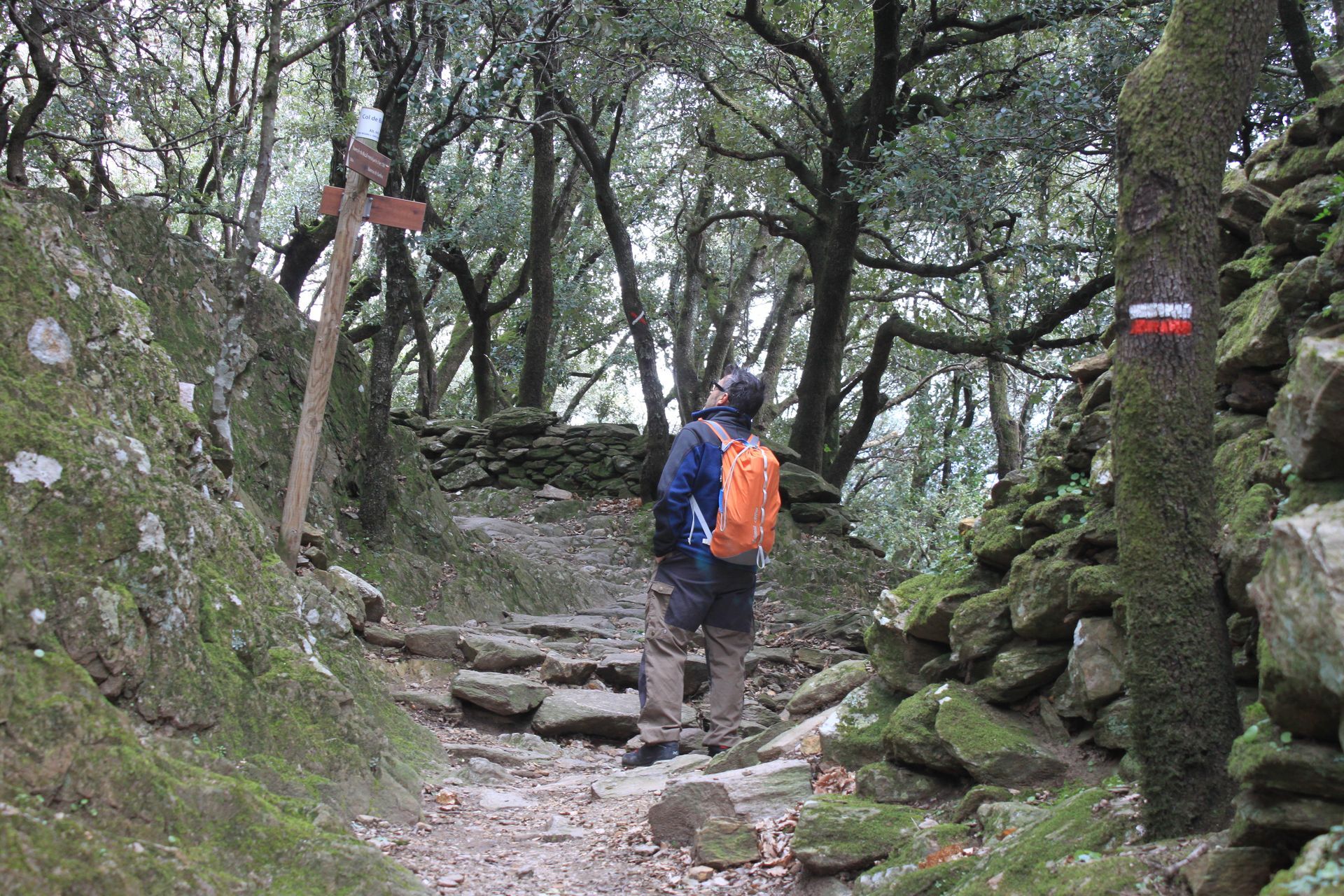 Descente vers l’ancien village de Mons Depuis le col, entamer la descente sur le sentier caladé bordé de châtaigniers et chênes verts en suivant le balisage trail du parcours n° 5. Ce tronçon est partagé avec des VTTistes : vigilance recommandée. Suivre le tracé jusqu’à rejoindre un sentier caillouteux. À l’approche du village, passage sur piste bétonnée. Traverser le village en descente jusqu’au petit parking.