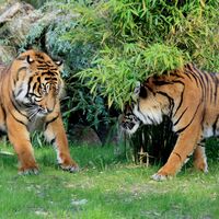 Ein Highlight im Zoozentrum ist der Tigertempelgarten. Besucher können die vom Aussterben bedrohten Sumatra-Tiger von verschiedenen Seiten aus durch Scheiben entdecken und eine fünf Meter hohe Aussichtsplattform bietet einen tollen Überblick über die grüne Anlage. Direkt gegenüber lebt die vierköpfige Elefantengruppe des Schölerbergs. Jungtier Minh-Tan ist drei Jahre alt und hat noch allerhand Unsinn im Kopf. Er saust über die Anlage, spielt mit Steinen und Stöcken und hält dabei Schwester Sita und Mutter Douanita auf Trab. Den ältesten der Gruppe, Elefantenbullen Luka, können die Besucher an seinen mächtigen Stoßzähnen erkennen.