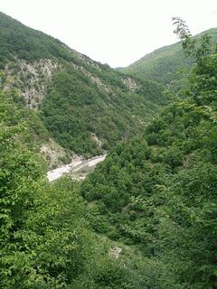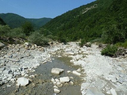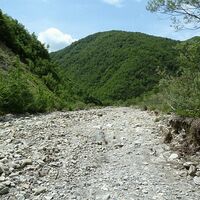 Il percorso prosegue tra i sassi nell’alveo principale per altri 500 metri, fino a trovare sulla sinistra un impluvio solcato da un piccolo rio, dove, nascosto dalla vegetazione, parte il ripido sentiero che risale il Costone Serraglie; la dura salita del versante boscato è resa ancor più ardua dalla vegetazione invasiva che tende a coprire la segnaletica: occorre procedere con attenzione, sia per la pendenza sia per trovare i segnavia che evidenziano il tracciato.