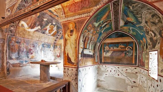 Kirche San Peyre di Stroppo: prächtiger Glockenturm im alpinen Gotikstil und im Inneren verschiedene Freskenszenen aus dem Spätmittelalter, darunter neben dem thronenden Christus, den Aposteln, Evangelisten und einigen Heiligen auch die interessante Szene der Dormitio Virginis (Entschlafung der Jungfrau) und in der kleinen Apsis das Fresko mit gemalter Musik, auf der der Hirte die Piva (Dudelsack) spielt, ein Symbol der Popmusik. Altes Krankenhaus und Lazzaretto: Der Bau im Weiler Caudano geht auf den 7. Juli 1463 zurück, dank des Interesses einer damaligen Adelsfamilie, der Agnesi. Die antike Struktur eines Krankenhauses „pro receptatione Christi pauperum“ kann noch heute bewundert werden.