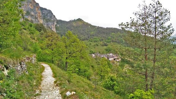 In “Camoglieres” hat man die Möglichkeit, den “Sentiero dei Ciclamini” zu begehen. Dieser führt entlang der Kalkwände von “Crocetta Soprana” und “Punta Raveirola” (Klettersteig und -wand). Im Frühling fasziniert das Gebiet durch sein reiches Orchideenblühen, im Spätsommer sind die typischen Alpenveilchen charakteristisch. Ab der “Borgata Langra” folgt man den Wegweisern in Richtung “Centenero/Caudano”, zunächst bergaufwärts bis zu einer Höhe von 1296 Metern, dann entlang eines Auf-und-Ab-Weges bis zur “Borgata Caudano”. Dort lohnt es sich, eine Pause beim antiken Lazarett aus dem Jahre 1463 einzulegen. Der Wanderweg verläuft nun konstant; die Aussicht von dort ist atemberaubend: der gotische Kirchturm der Kirche “San Peyre di Stroppo” aus dem 13. Jahrhundert, im Hintergrund die Gipfel des Hochtals und die am Steilhang gelegene “Borgata San Martino”, gleichzeitig Etappenziel. Der Weg dorthin durchquert die Siedlungen “Cucchiales” und “Ciamin”.