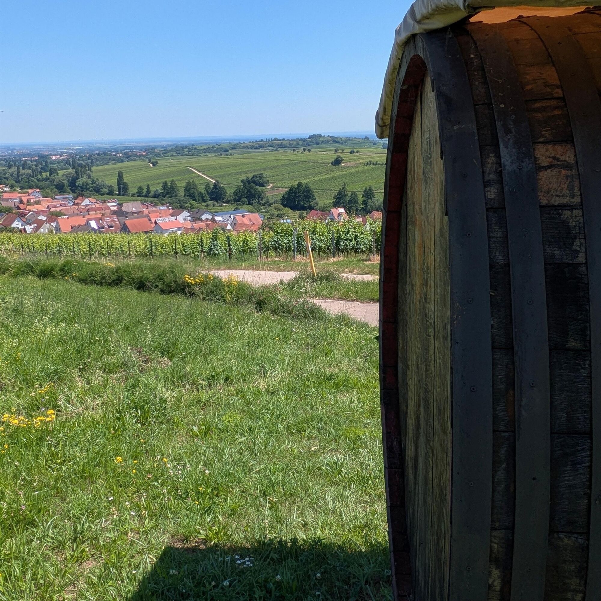 Ihr startet eure Wanderung in Ranschbach in der Peter-Morio-Straße. Die Wegemarkierung mit dem Römer-Helm zeigt euch den Weg und führt euch schnell (und dafür auch etwas steil) raus aus dem Ort und rein in den Weinberg. Schon bald erreicht ihr den Pfälzer Strandkorb. Strandkorb? Strandkorb! Denn auch in der Pfalz gibt es ein Meer – das Rebenmeer. Und auf genau das und über Ranschbach hinweg, könnt ihr von hieraus schauen. Regionaltypisch ist der Pfälzer Strandkorb natürlich auch aus einem alten Holz-Weinfass gebaut.