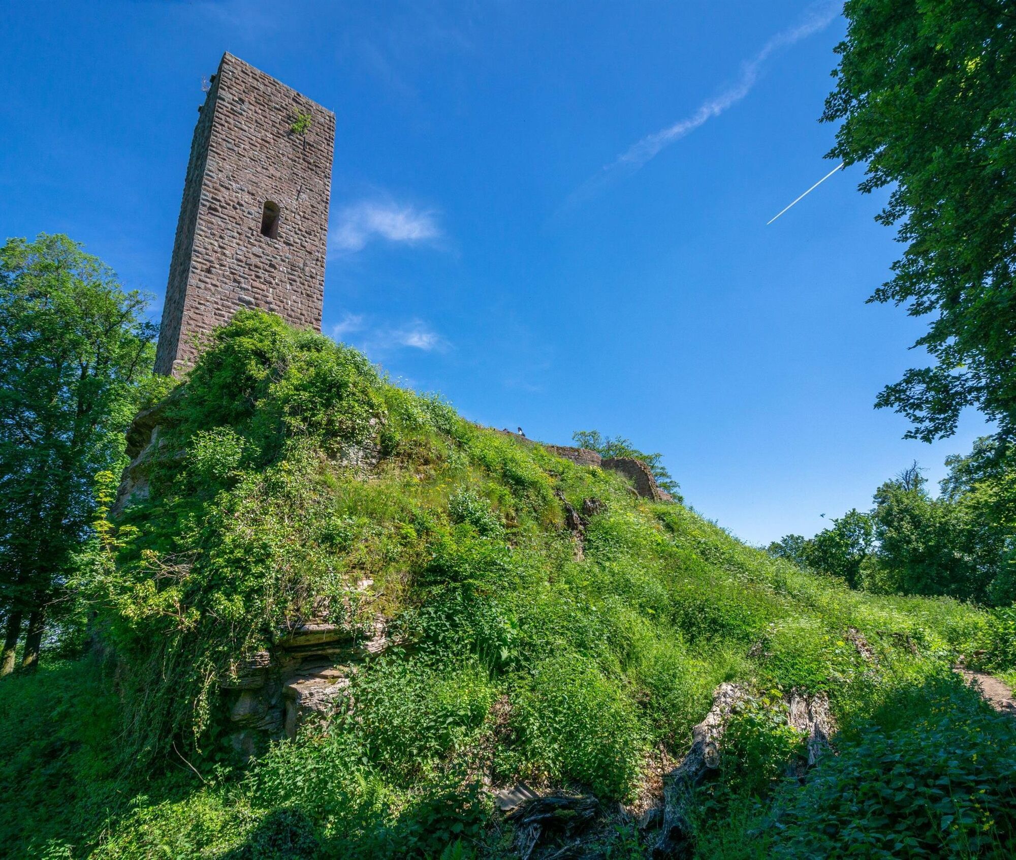 Wieder zurück am Parkplatz Schlossäcker schließt ihr den Kreis um das Burgentrio Trifels, Anebos und Münz und kommt wieder an den Parkplatz Ahlmühle. Ein letztes Mal geht es bergauf zum höchsten Punkt der Tour: Das Wettereck. Von hier aus blickt ihr nochmal zurück auf die Burgendreifaltigkeit. Und während ihr nun gemütlich abwärtsgehend und noch immer über das Gesehene und Erlebte nachdenkt, findet ihr euch schon wieder am nächsten Höhepunkt und an der nächsten Burgruine. Die ehemalige Burg kann man nur noch erahnen, nicht mehr viel ist davon übriggeblieben. Aber der Aufstieg auf die Burgruine Neukastel über die Gitterleiter (nichts für schwache Nerven oder Menschen mit Höhenangst!) öffnet euch noch einmal die Augen: Weit reicht der Blick über die Rebenlandschaft und die kleinen Weindörfer. Und nun scheint auch der Standort der Burg ganz logisch. Denn vermutlich wurde die Burg Neukastel Anfang des 12. Jahrhunderts gebaut, um den Taleingang Richtung Burg Trifels zu schützen, denn den Feind konnte man schon von Weitem kommen sehen.