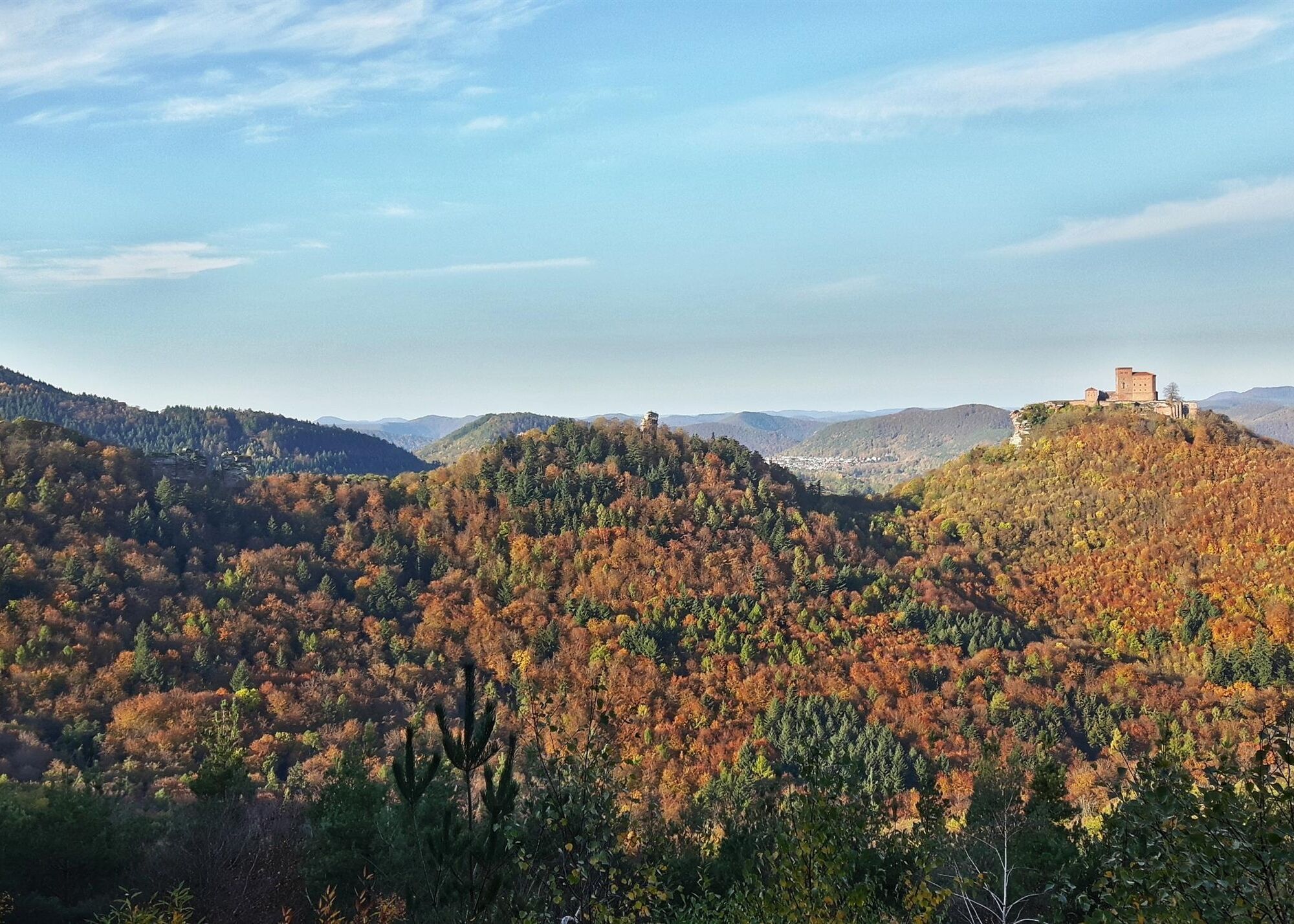 Leicht aber stetig steigend geht es weiter durch den Wald und zum Parkplatz Ahlmühle. Ab hier beginnt der Burgen-Erkundungs-Teil! Folgt hier dem Wegweiser Richtung "Burg Trifels" und "Ruine Scharfenberg/Münz". Macht unbedingt kurze Abstecher zu den Burgruinen Scharfenberg/Münz und Anebos. Von Anebos ist zwar nicht mehr als ein Felsen übrig, aber die Aussicht auf Burg Trifels, die ihr kurz darauf erreicht, ist den Abstecher allemal wert!