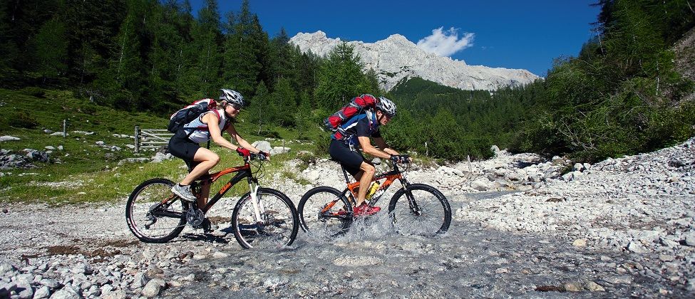 Von Golling starten wir 12km über den flachen Tauernradweg nach Hallein, von wo wir über Winterstall und Kranzbichl Nebenstraßen bergauf fahren. Bei Gmerk verlassen wir Salzburg und wechseln ins benachbarte Bayern, wo wir bald auf die Roßfeldstraße treffen, welcher wir nun fast 13km folgen. Viele schöne Panoramablicke tun sich auf dieser Strecke auf, allerdings mit dem Nachteil, dass man sich die Straße mit vielen Autos und Motorrädern teilen muss. Beschaulicher sind die anschließenden 15km, auf welchen man in ständigem leichten Auf und Ab durch die Wälder des schönen Berchtesgadenerlands fährt, ehe man in einem wirklich sehr steilen Anstieg 600Hm hinauf zum Carl-von-Stahl-Haus überwinden muss. Wieder auf der österreichischen Seite folgt eine längere Schiebestrecke (bitte unbedingt einhalten) hinunter zur Jochalm und die nicht ungefährliche Abfahrt hinunter nach Golling (siehe TG19).