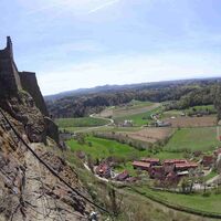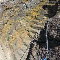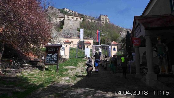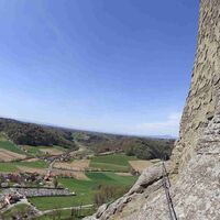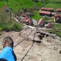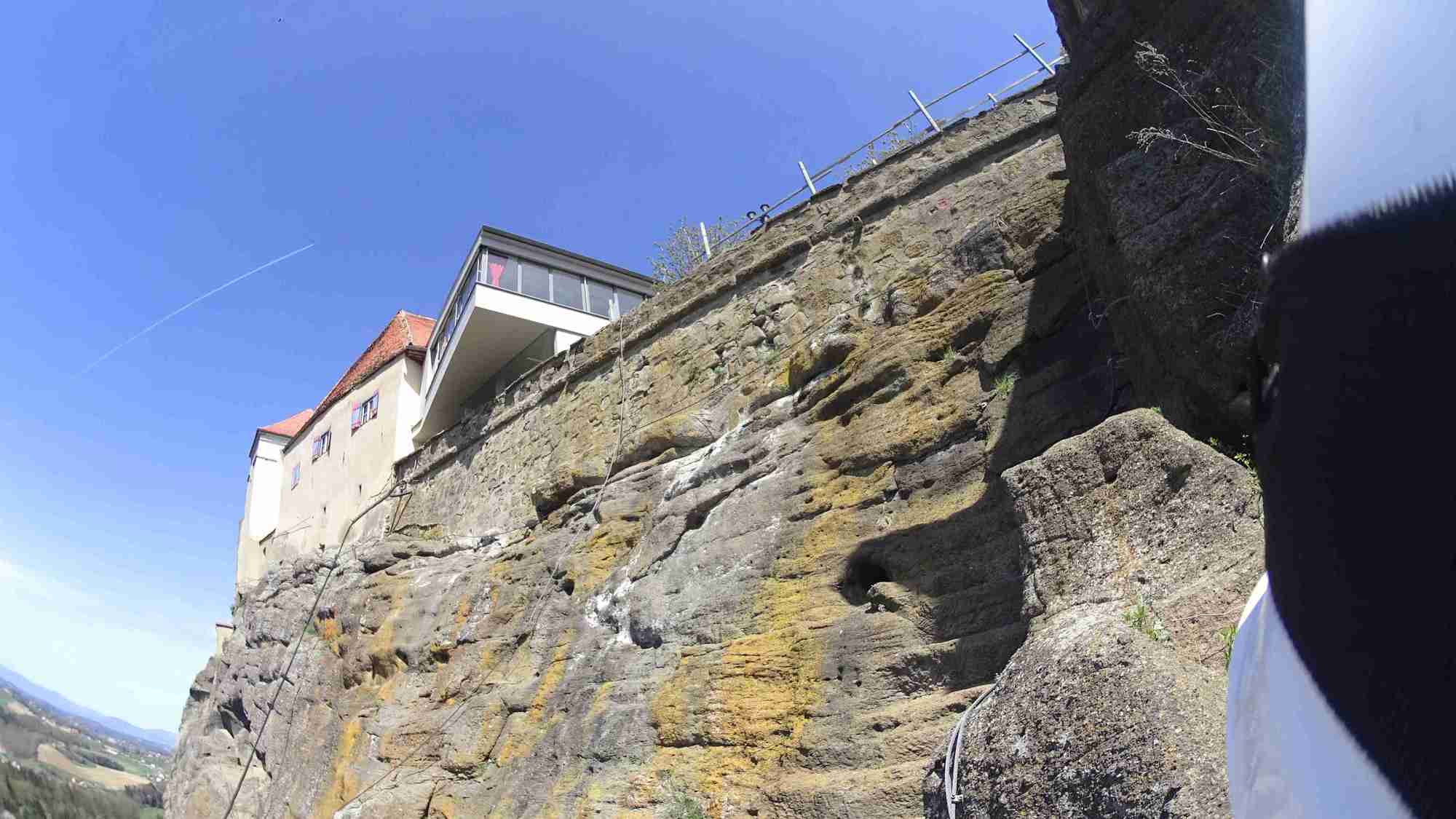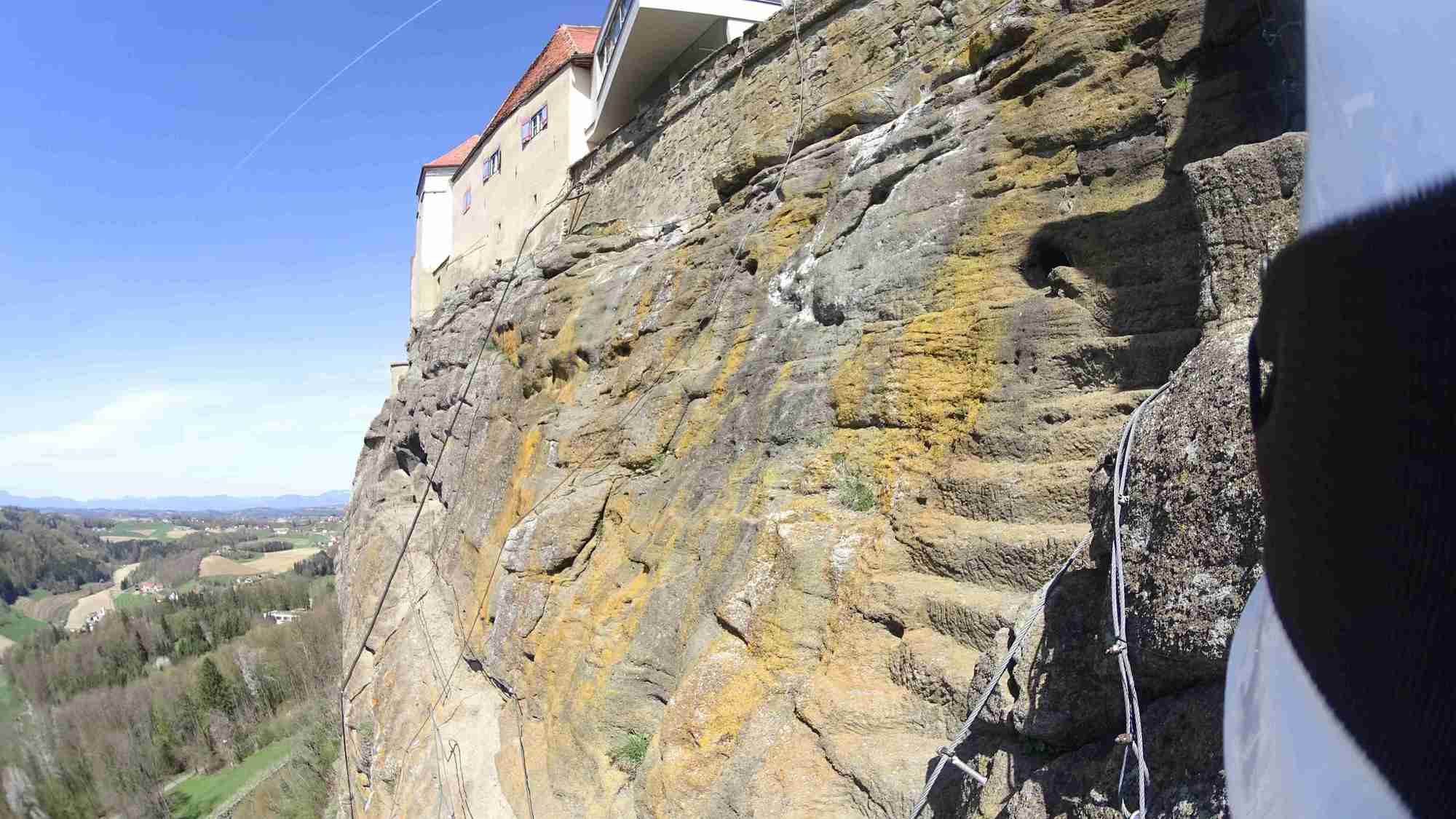 Dieser leichte Klettersteig führt in einer 190 m langen Querung durch die Südwestwand und endet direkt im Gastgarten der Burgtaverne.