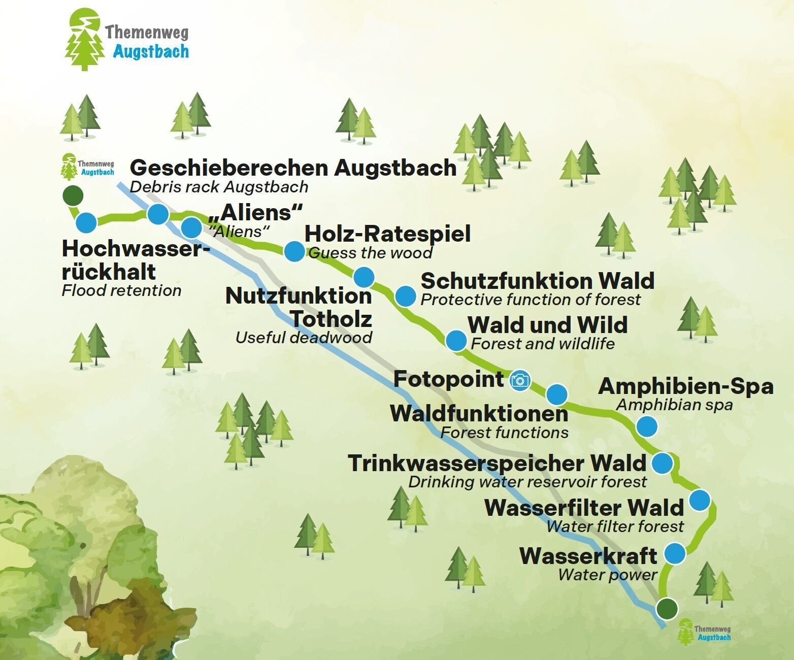 Die Tour verläuft parallel zum Augstbach und entlang von Wildbach- & Lawinenbauwerken. Der Einstieg befindet sich im Ortszentrum von Altaussee. Entlang des Weges warten 14 spannende und sorgfältig gestaltete Stationen mit Schautafeln, Spielen und weiteren Attraktionen auf die Besucherinnen und Besucher.