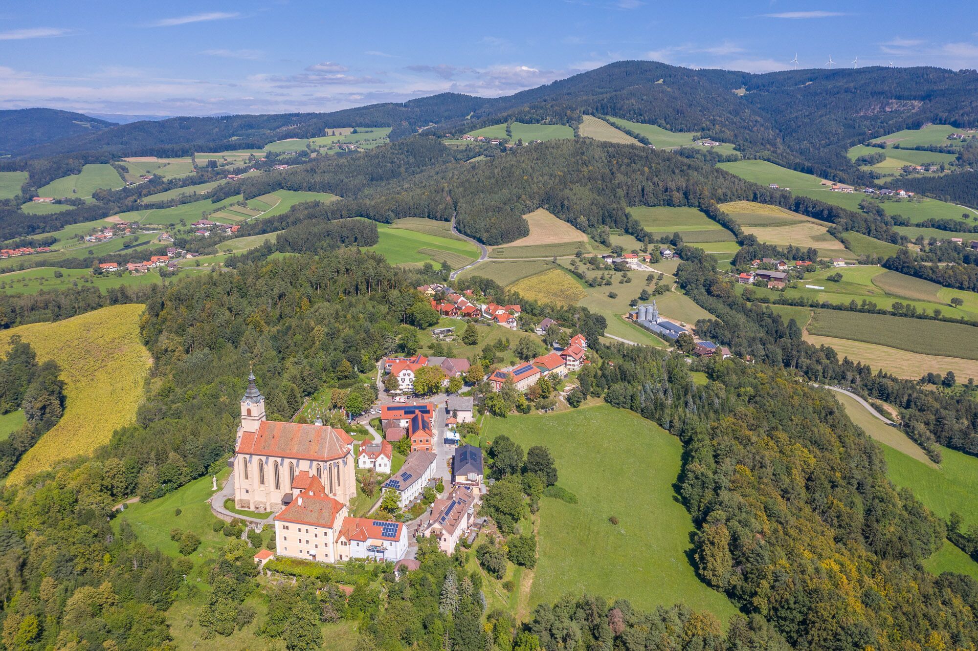 Ausgehend vom Hotel Muhr wandern wir die Zufahrtsstraße in südliche Richtung bis wir auf einen Feldweg stoßen, der links von der Gemeindestraße weg in den Wald führt. Der Markierung folgend gelangen wir zum Aussichtspunkt "Panoramablick".Hier halten wir uns wieder links und erreichen über den Höhenweg Richtung Masenberg die Gemeindestraße. Nun gehen wir Richtung Pöllau talwärts bis wir zur Wegkreuzung mit der weiß-rot-weißen Markierung mit der Nr. 6 Richtung Pöllauberg zu den Bauernhöfen der Familien Harb, Maierhofer und Schweighofer kommen und in ihre Richtung abbiegen.Zwischen Wohnhaus und Stallgebäude der Familie Maierhofer führt uns der markierte Wanderweg über Naturwegen und Pfaden zum Bauernhof der Familie Gleichweit, wo wir weiter auf der Gemeindestraße bleiben bis kurz vor dem Bauernhof der Familie Grabner.Hier biegen wir kurz hintereinander zweimal scharf links ab und gelangen der weiß-rot-weißen Markierung Nr. 6 folgend durch Wälder und vorbei an Äcker und Wiesen auf die Landesstraße Pöllauberg - Masenberg. Wir halten uns rechts und kommen sogleich zur Kreuzung über die wir den Wallfahrtsort erreichen.Wichtige Telefonnummern:
