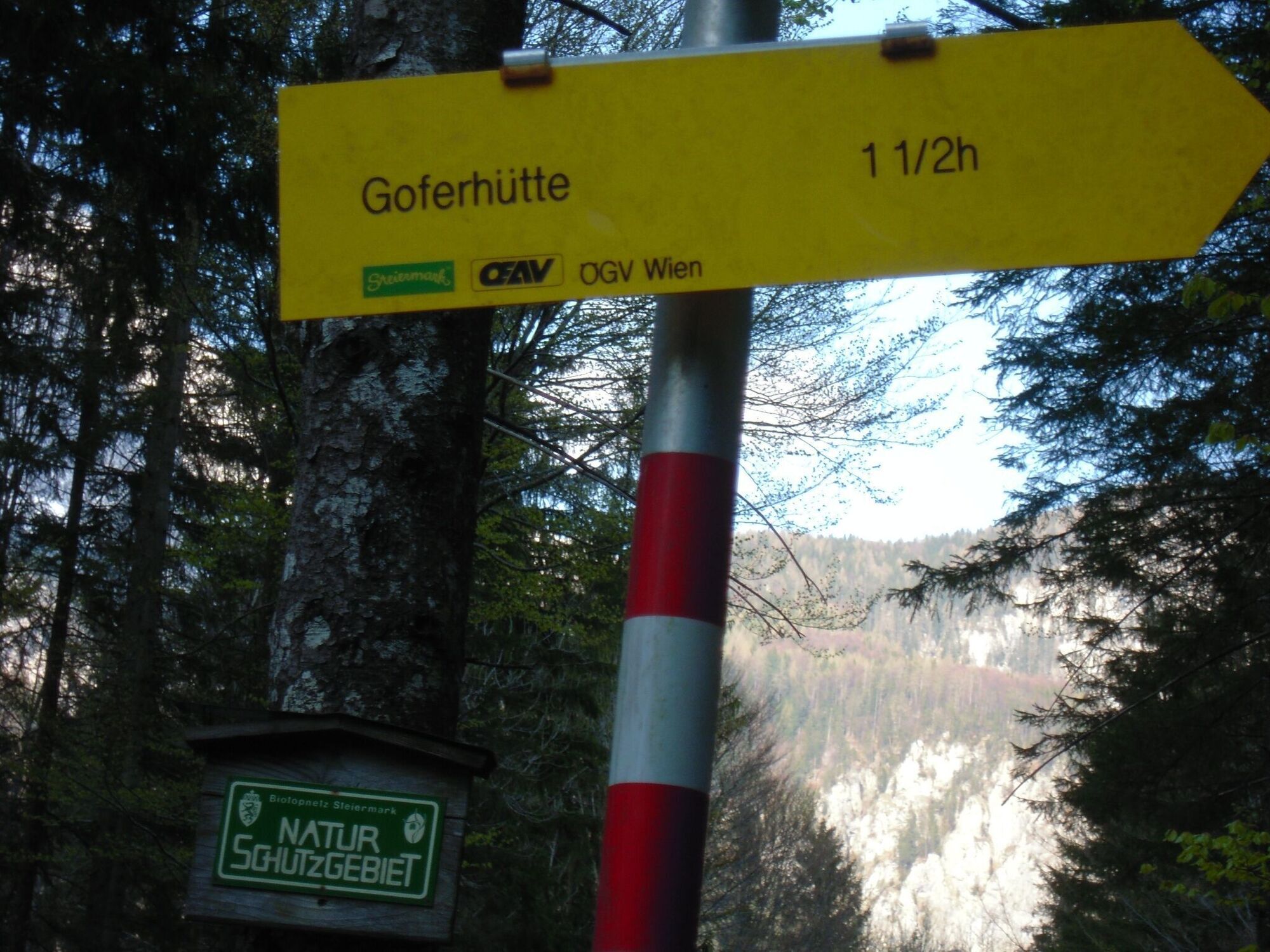 Wir beginnen unsere Wanderung gleich mit einer ordentlichen Steigung der Forststraße. Die Aussicht auf den Admonter Reichenstein belohnt uns aber für die Mühe. Bald verschwindet die Straße in einem kühlenden Mischwald, besonders im Frühjahr begleiten uns viele verschiedene Vogelstimmen vom Kuckuck über den Zilpzalp bis zu verschiedenen Spechtarten. Auch die Flora ist hier, besonders in den oberen felsigen Teilen entlang des Weges, besonders üppig. Beeindruckend ist im Frühjahr eine steile Felswand neben der Forststraße, prallvoll mit Petergstamm, der Alpen-Aurikel. Aber bitte nur bestaunen und mit der Digicam jagen, sie ist streng geschützt. Nach zahlreichen Kehren haben wir die Höhenmeter geschafft und wandern über eine flache Wegstrecke, den Goferbach querend, zu einer kleinen Almwiese, der Goferalm mit der Goferhütte. Rund um die Hütte suchen wir uns einen bequemen Platz zum Jausnen. Mit etwas Glück können wir einen Steinadler beobachten, der die Thermik nördlich des Reichensteins nutzt, um an Höhe zu gewinnen. Schließlich machen wir uns wieder auf den Rückweg, mit offenen Augen, um die Aussicht auf Buchstein und Tamischbachturm, im unteren Bereich dann auf die imposante Mauer des Himbeersteins und auf den Admonter Reichenstein zu inhalieren.