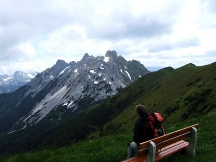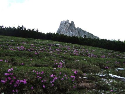Unsere Wanderung beginnt gleich mit dem Aufstieg auf den Polstergipfel. Erzberg, Kaiserschild, Reichenstein sind zum Greifen nahe. Wir müssen dann einige Höhenmeter absteigen,und kommen wieder auf den Weg zur Leobner Hütte, der nur den Gipfelhang des Polsters umgeht. Am Hirschegger Sattel führt ein Weg zur Frauenmauer, einer zur Leobner Hütte,einer auf die TAC Spitze und unserer führt zum Lamingsattel und weiter Richtung Hochturm. Beim Lamingsattel gibt es die Möglichkeit nach Tragöss bzw. zum Präbichl abzusteigen. Wir gehen jedoch den schmalen , etwas felsigen Steig mit Blumen umrahmt weiter bis zur Abzweigung Leobner Mauer. Von hier ist es nur mehr eine halbe Stunde auf den Gipfel, wo uns ein interessantes Gipfelkreuz erwartet. Ein herrlicher Platz zum Verweilen mit gr0ßartiger Aussicht.