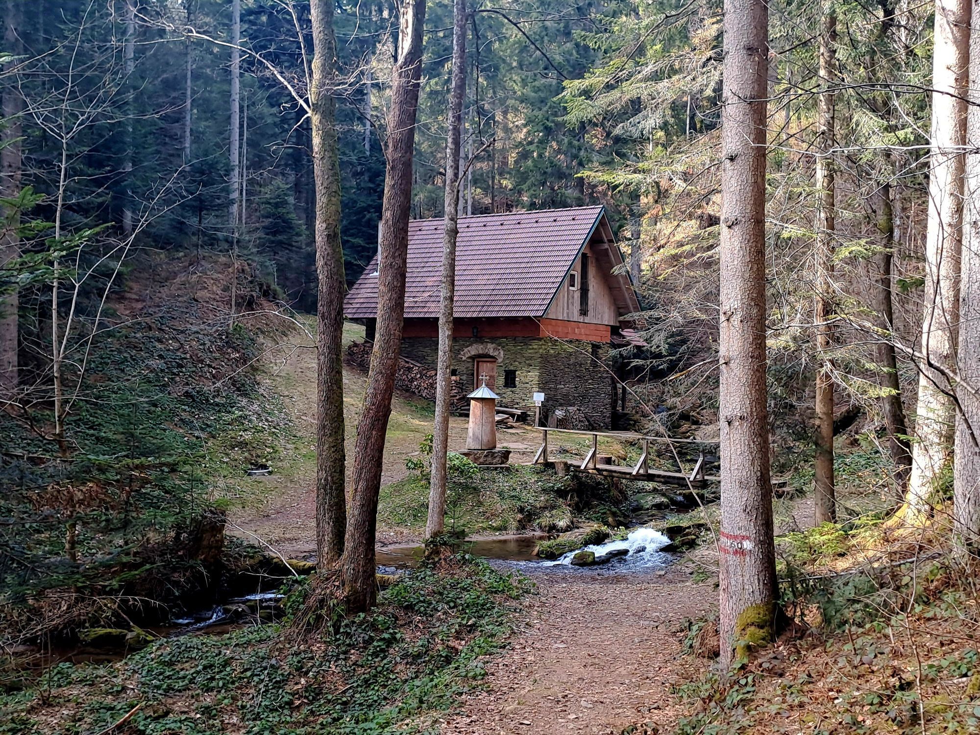 Hier gäbe es die Möglichkeit, bei der ersten Kehre schon in den Wald zu geben, laut Karte kommt man dort auch zur Hahnhofhütte. Ich entschloss mich aber der Asphaltstrasse ein paar Minuten weiter zu gehen und dann links der Markierung in den Wald zu folgen. Hier überquerte ich den Bach und war nach kurzer Zeit bei der Hahnhofhütte.